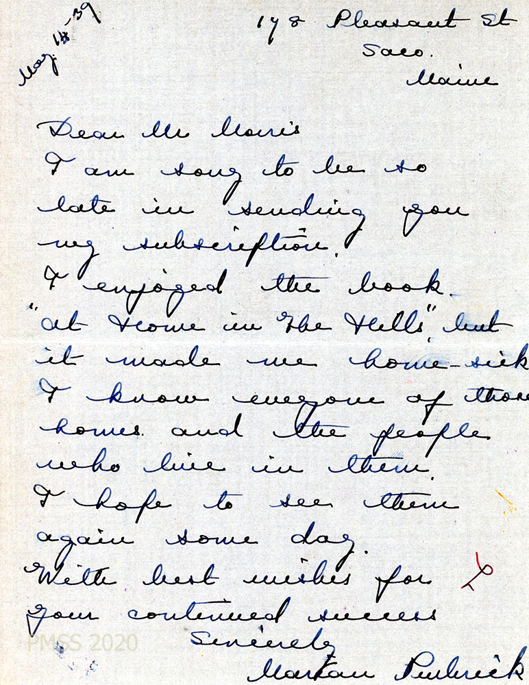 [1939_061] May 14, 1939. To Morris from Purbrick, Saco, Maine. “I enjoyed the book, ‘At Home in the Hills,’ but it made me home-sick. I know everyone of those homes and the people who live in them…”