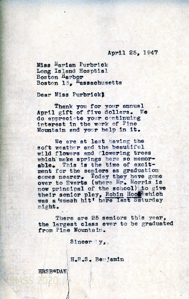 [1947_068] April 25, 1947. To Purbrick from Benjamin, thanking her for her $5 gift; gives updates: spring, graduation of 25 seniors, the largest PMSS class ever. “Today they have gone over to Evarts (where Mr. Morris is now principal of the school) to give their senior play, ‘Robin Hood’….”