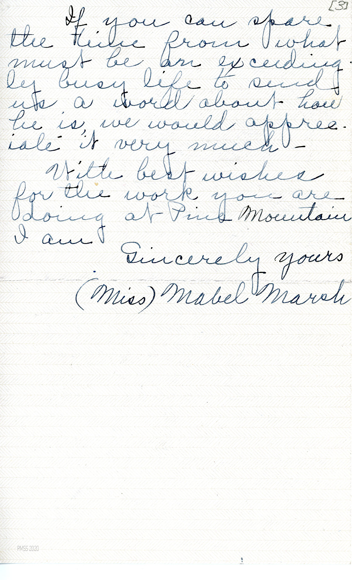[055] through [055b] December 6, 1937. To “The Headmaster of Pine Mountain Seminary (sic),” Pine Mountain, KY, from Miss Mabel Marsh, Brookline, MA, asking about Young. He had not heard from him since Young left the home of Mr. and Mrs. Porter where he also lives and all are worried about him.
