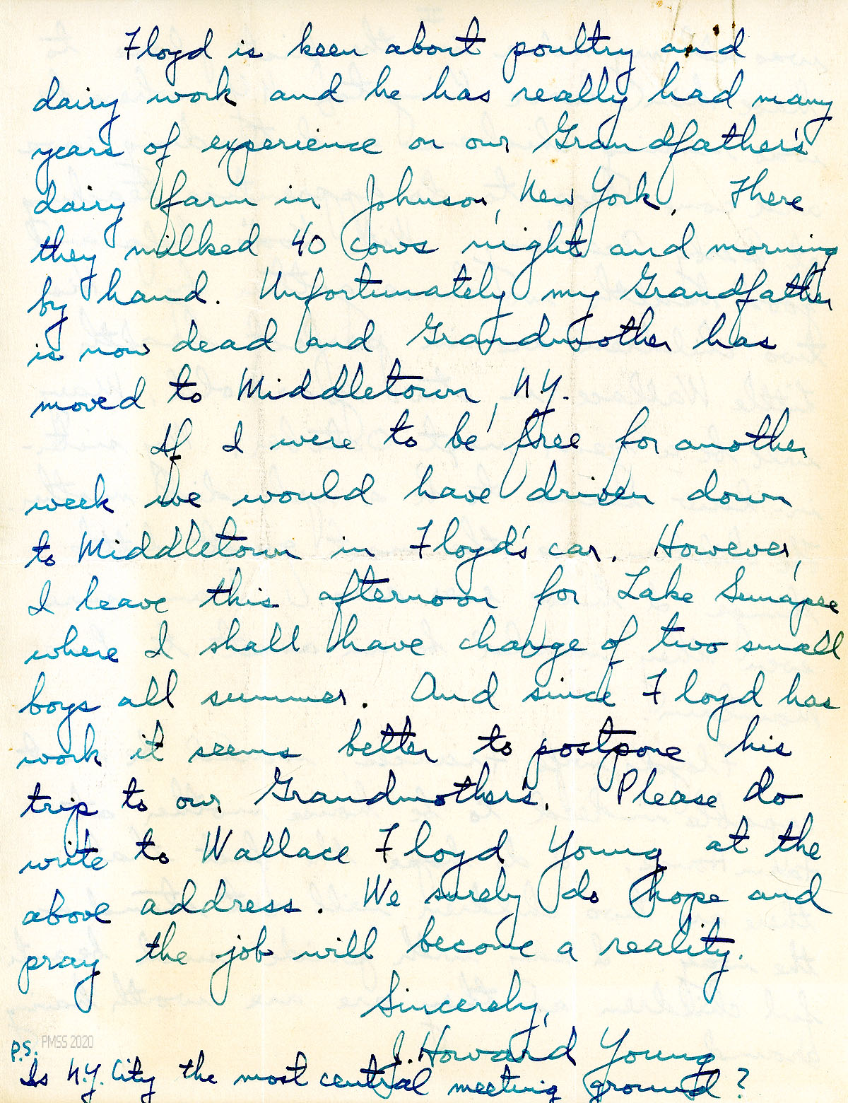 [010] through [010d] July 15, [no year]. Handwritten 5-page letter to Morris from Dorothy Bolles in Coliasset(?). [010] Bolles interviewed [Wallace] Young in Wells’ place; [010a] Describes Young’s interest in the job of assistant farmer; describes his experience. [010b] Slightly built, he is more interested in poultry and cows than working the land; “quiet, educated, pleasant.” [010c] Bolles will meet his wife later. [010d] Closing.