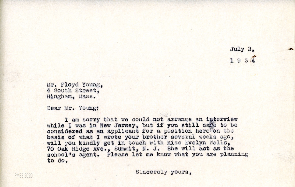 [008] July 2, 1934. To Young from [unsigned, apparently Morris], who regrets they could not meet, but if Young is interested in a position “on the basis of what I wrote your brother several weeks ago,” he should write to Evelyn Wells in Summit, NJ, who is the School’s agent.