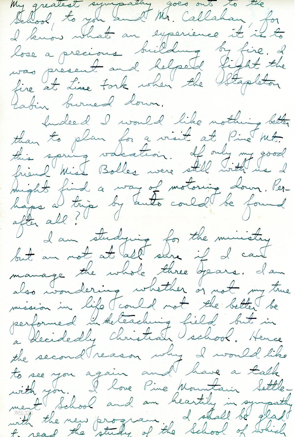 [013] December 30, 1935. To Young in Pelham, NY, from Morris, who regrets that he can’t meet with Young; is sending him his study for “a more intensive guidance program here at the school with very much emphasis on individual work. … With the growth of …schools throughout the mountains, our mission seems to be heading towards more and more selectivity, particularly in our choice of students, and our emphasis must be on the type of education which cannot be obtained from the state and county schools.” Morris invites Young to visit PMSS via bus and train.
