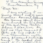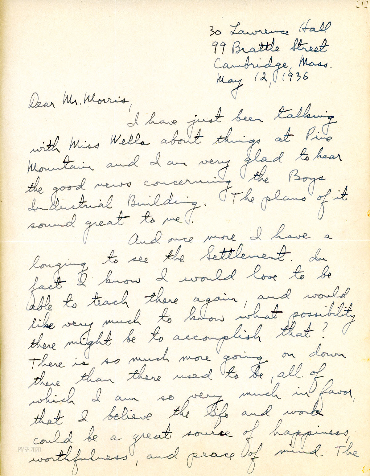 [016], [016a] May 12, 1936. Two-page letter to Morris from Young, who heard good things from Miss Wells about plans for the Boys Industrial Building. Asks Morris if he could teach at PMSS again: “…I believe the life and work could be a great source of happiness, worthfulness, and peace of mind.” [016a] “The development of the mind in the academic fashion has its rightful place but education that leaves out the hand and the heart is the destruction of the soul. Every phase of human development should come under the school’s guiding hand and I believe Pine Mountain Settlement is trying to accomplish that idea. Therefore, I wish I could be of some service at the School once more.”