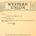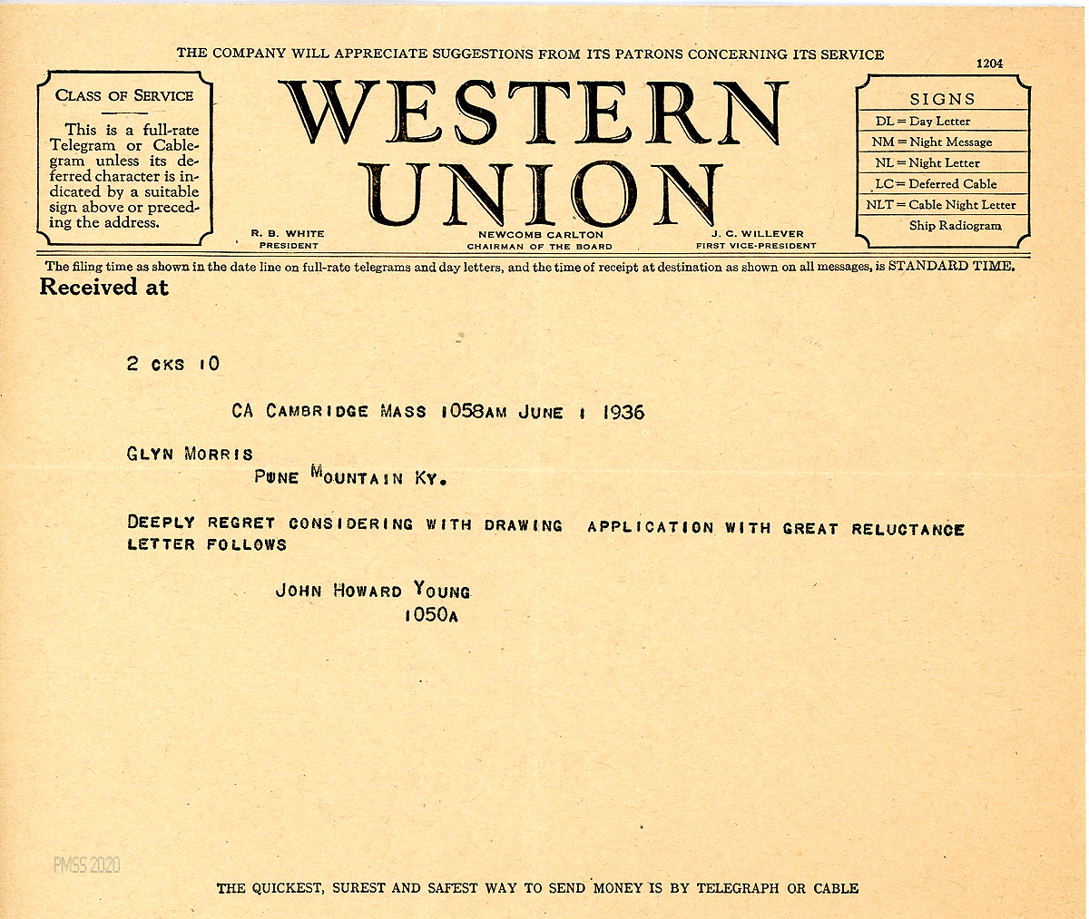 [021] June 1, 1936. Western Union Telegram to Morris from Young. “Deeply regret considering withdrawing application with great reluctance….”