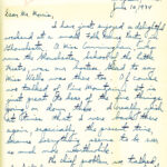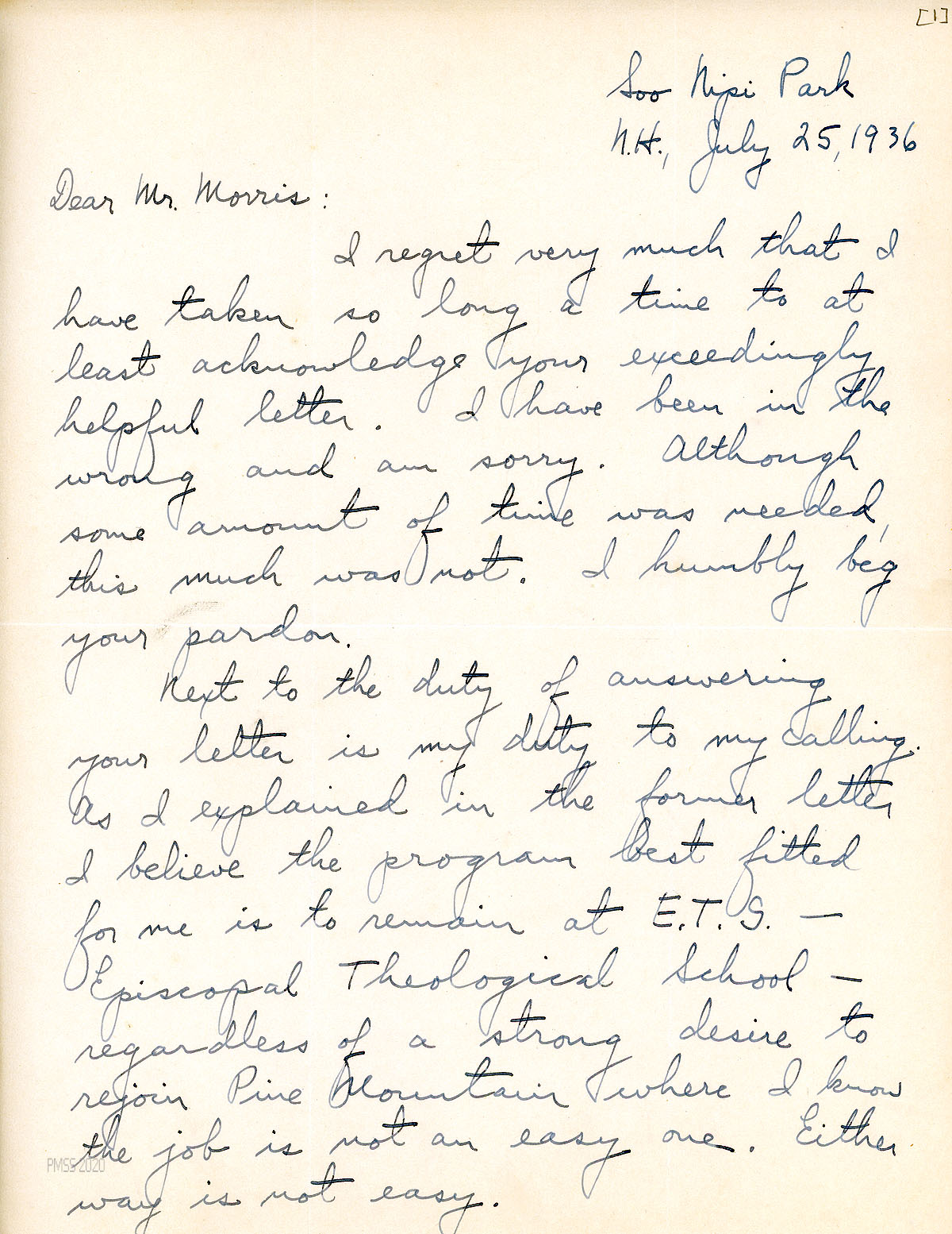 [023], [missing 2nd page] June 5, 1936. To “John” [Young] at Soo-Nipi Park, NH, from Morris, who understands his “problem of working out the kind of program which is going to be best for you.” Morris offers his thoughts on “finding one’s place in life.” Describes the advantages of coming to Pine Mountain, referring to the work as “applied religion.”