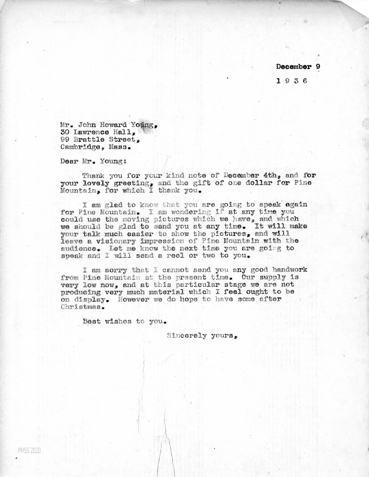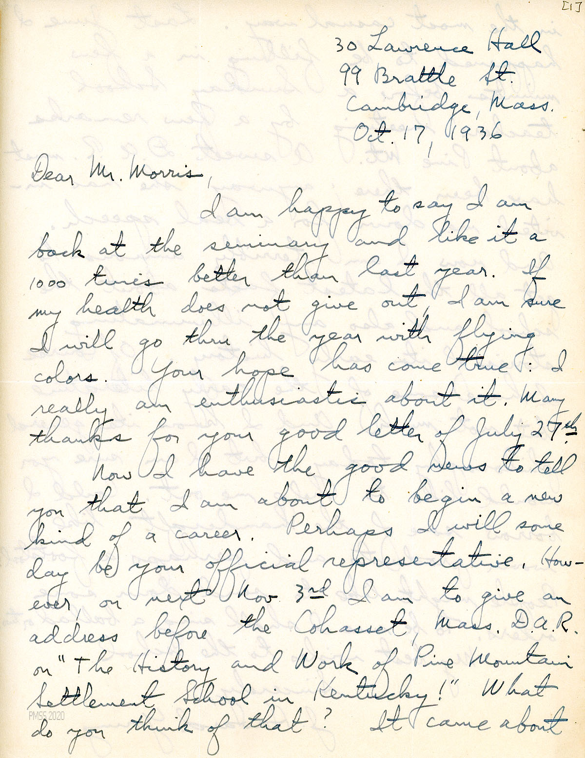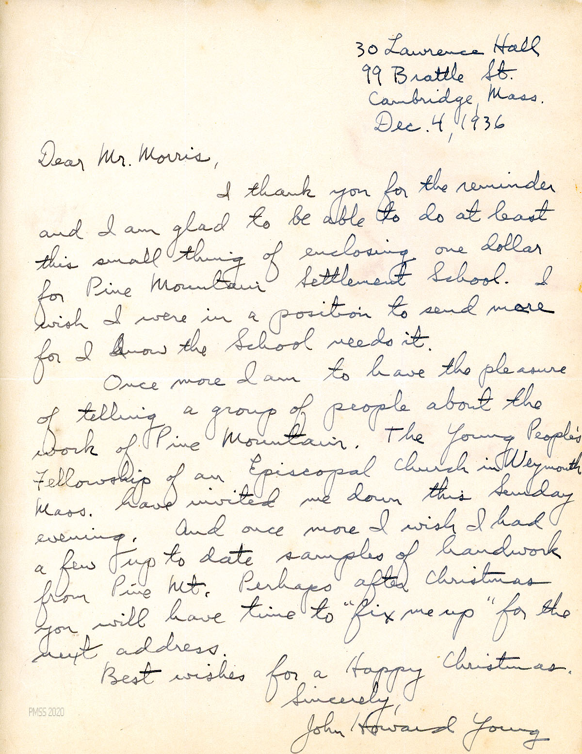 [026], [026a] October 17, 1936. Two-page letter to Morris from Young in Cambridge, MA, who has returned to the seminary and is “enthusiastic about it.” He will be giving an address before the Cohasset, MA, DAR on “The History and Work of Pine Mountain Settlement School in Kentucky.” He tells how this came about and asks for details of PMSS history and PMSS handcrafted items.