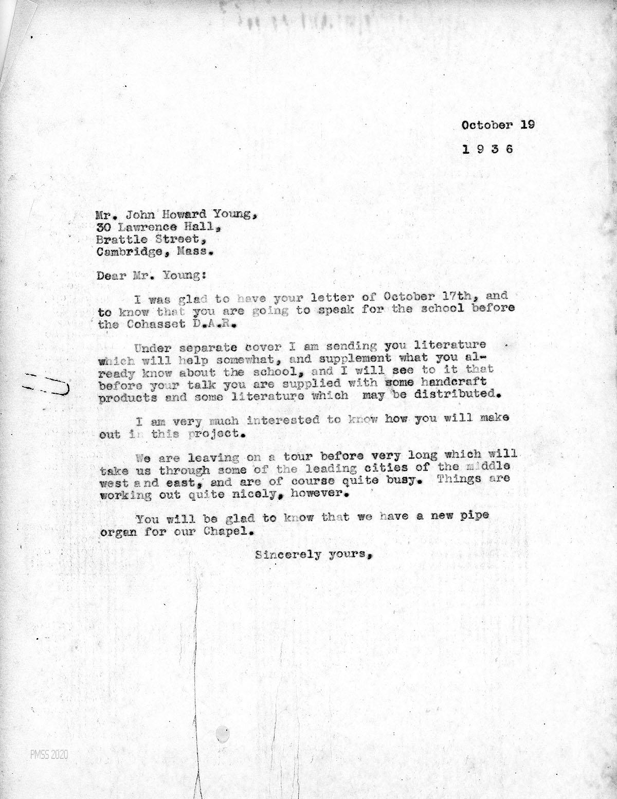[027] October 19, 1936. To Young from [unsigned – Morris], who will be sending PMSS literature and handcraft products. Morris is leaving on a tour of cities in the midwest and east. Mentions new pipe organ in the Chapel.