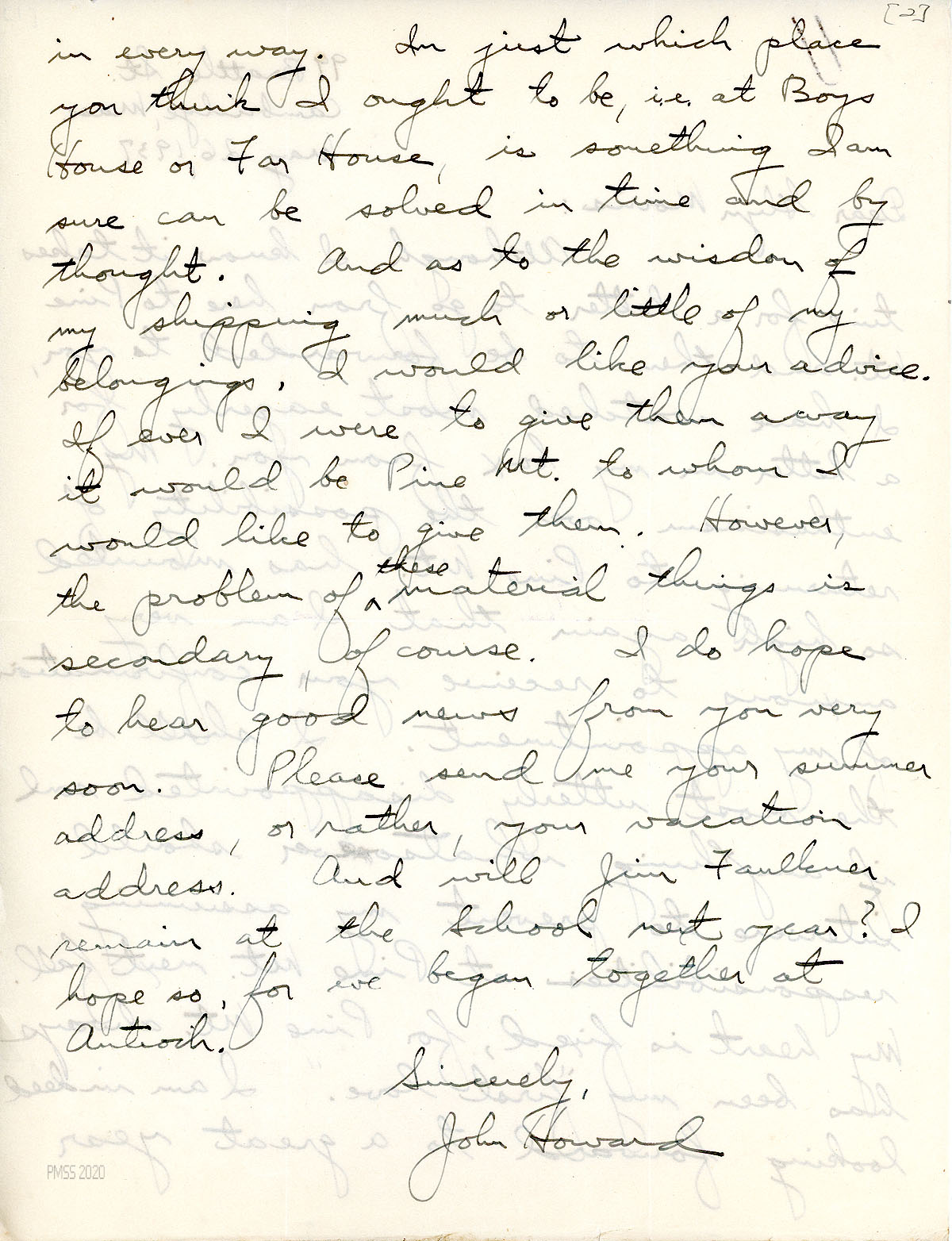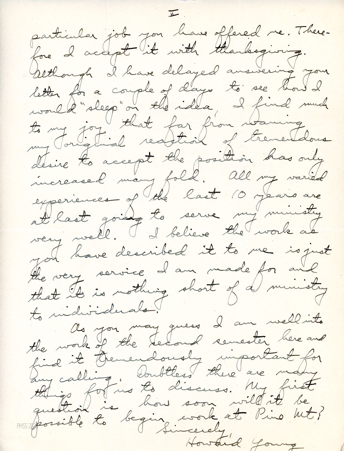 [033], [033a] March 4, 1937. Two-page letter to Morris from Young, [033] who describes using the PMSS film that Morris sent and asks for other films of the School; is enthusiastic about [033a] the counselor job offer and accepts it, feeling “that it is nothing short of a ministry to individuals.”