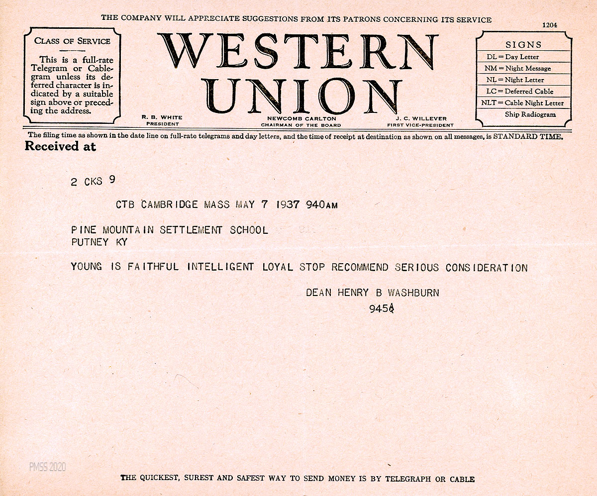 [041] May 7, 1937. Western Union telegram to PMSS from Dean Henry B. Washburn, Cambridge, MA. “Young is faithful, intelligent, loyal. Recommend serious consideration.”