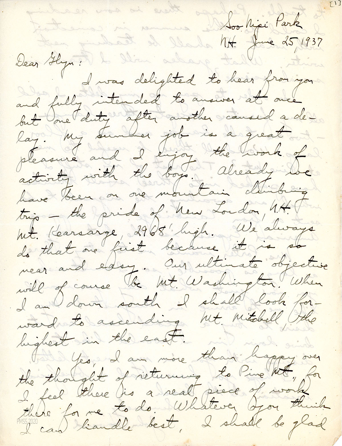 [049], [049a] June 25, 1937. To “Glyn” [Morris] from Young at Soo Nipi Park, NH, who was “delighted” to hear from Morris. Tells about his summer job supervising boys which he enjoys. [049a] Asks what grades he will teach in social science; has three trunks packed for shipping to PMSS; asks about arrival date.