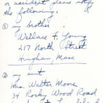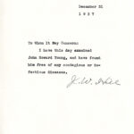 [054], [054a] N.D. From Young on “John Howard Young, PMSS” letterhead, [054] indicating who to notify in case of illness or accident: (1) His brother, Wallace F. Young in Hingham, MA. (2) His aunt, Mrs. Walter Moore in Manhasset, Long Island, NY. [054a] December 31, 1937. “To Whom It May Concern” from Dr. J.W. Hill, Richmond, KY, confirming that Young is “free of any contagious or infectious diseases.”