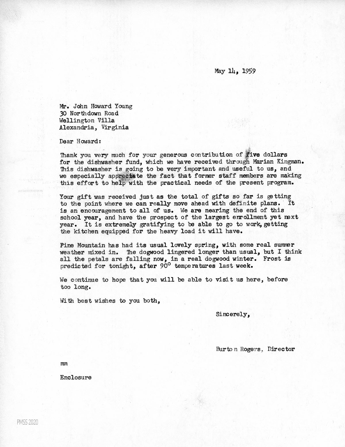 [056] May 14, 1959. To Young from Rogers, thanking him for his $5 gift for the dishwasher fund, “which we have received through Marian Kingman.”