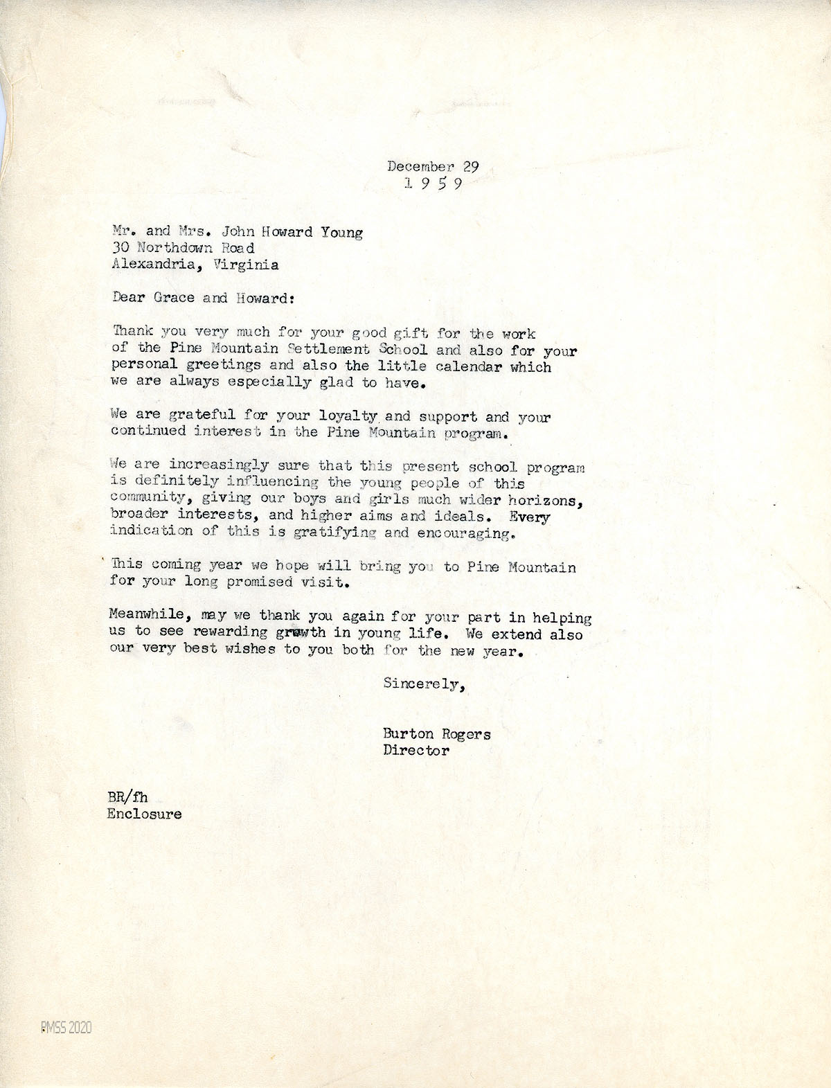 [057] December 29, 1959. To “Grace and Howard” [Young] from Rogers, thanking him for his gift and calendar; tells about the success of the present school program.