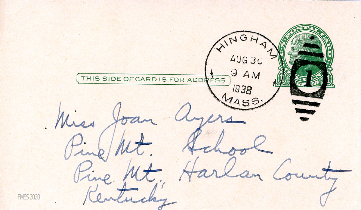 [007], [007a] August 30, 1938 [date stamp]. Two sides of a postcard to Joan Ayers at PMSS from Young in Hingham, MA, who describes his travels with John Blanton to PMSS and his arrival date.