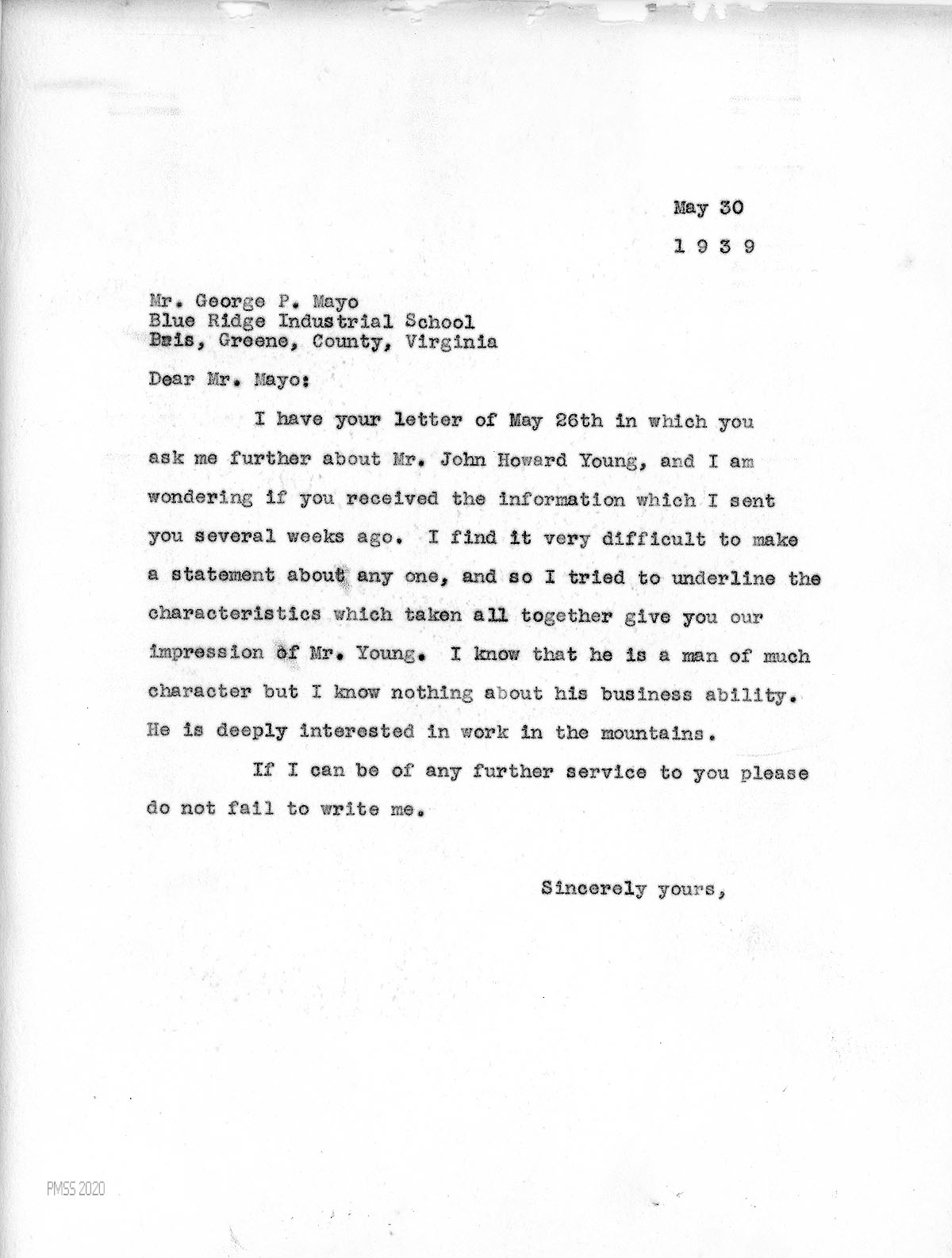 [011] May 30, 1939. To Mr. Mayo from [unsigned, apparently Morris], who wrote that he had sent information about Young earlier, with underlined characteristics. “I know that he is a man of much character but I know nothing about his business ability. He is deeply interested in work in the mountains,”