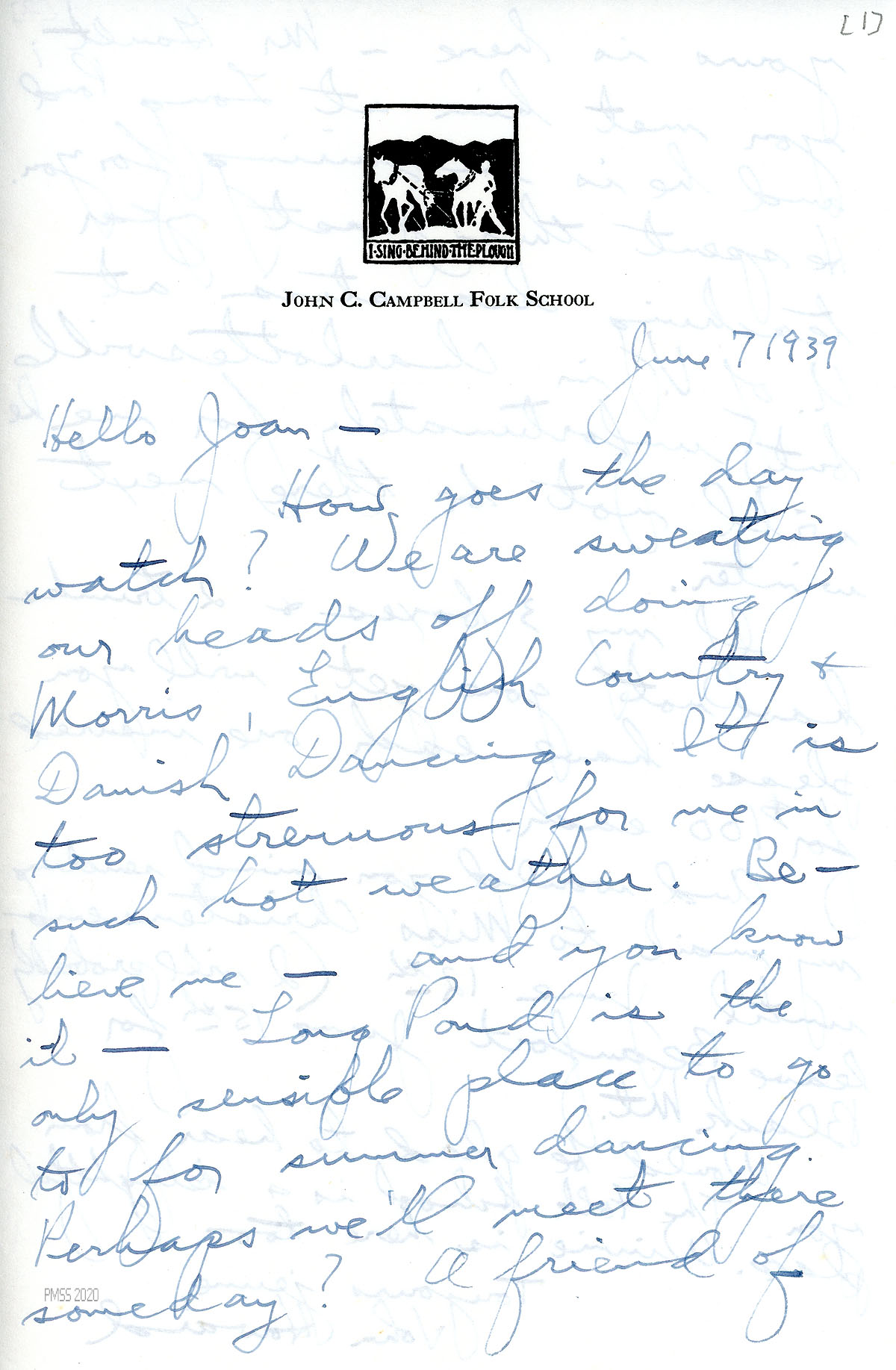 [012], [012a] June 7, 1939. Two-page letter to Joan Ayers from Young on John C. Campbell Folk School letterhead, [012] who mentions Morris, English Country, and Danish Dancing and possibly meeting her at Long Pond someday. [012a] Mr. Gault at Campbell School is asking about Joan; he is teaching dramatics at Univ. of Va., Charlottesville. Gives forwarding address at Miss Christensen’s. “The Folk School is a delightful place. Winnie [Christensen] is here too.”