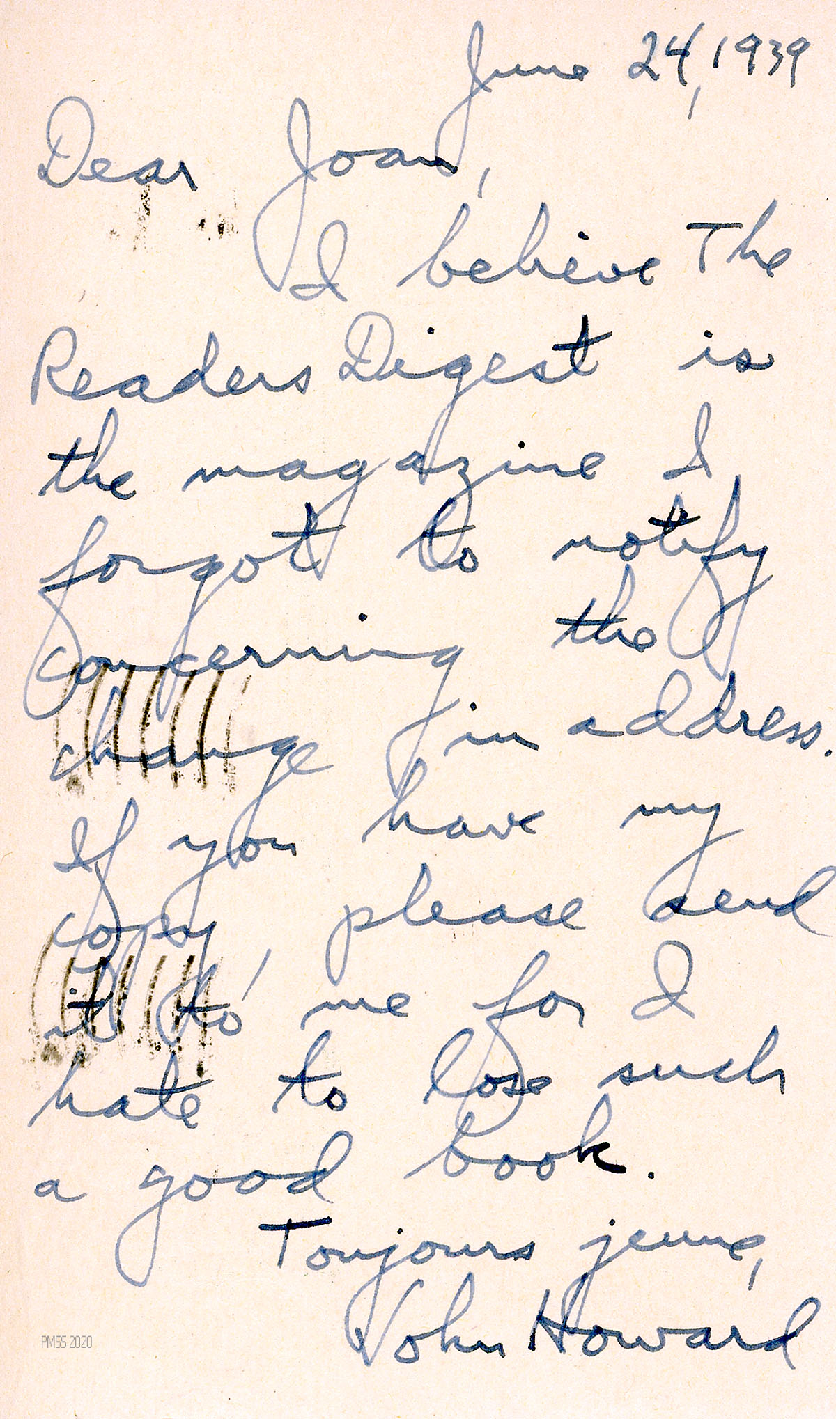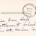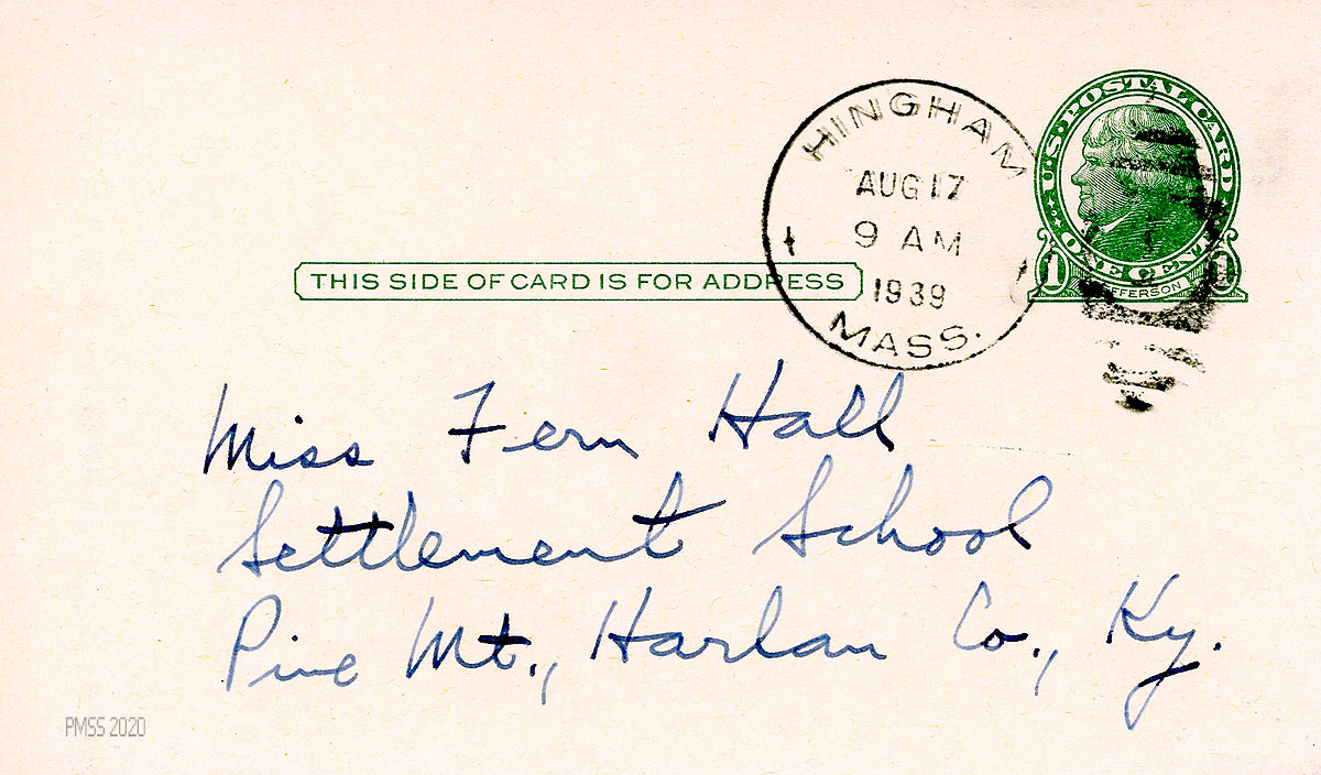 [014], [014a] July 6, 1939 [date stamp]. Two sides of a postcard to Fern Hall from Young, who “will miss ‘you all’ next year” and asks for his magazines to be forwarded from PMSS, except the Courier Journal which he leaves for the boys at Boys House.
