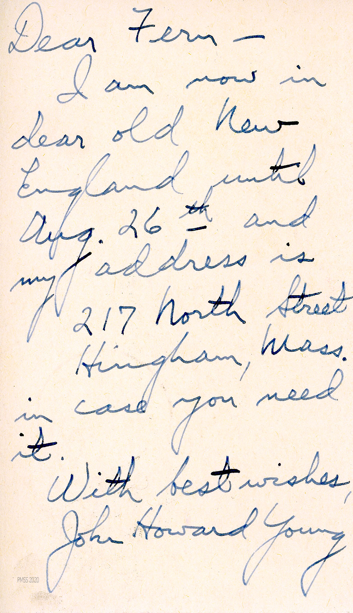 [019] N.D., no addressee. A note from Young on PMSS letterhead, providing his forwarding address as ℅ Miss [Abby] W. Christensen in Beaufort, SC. After June 7: Black Mt. NC.