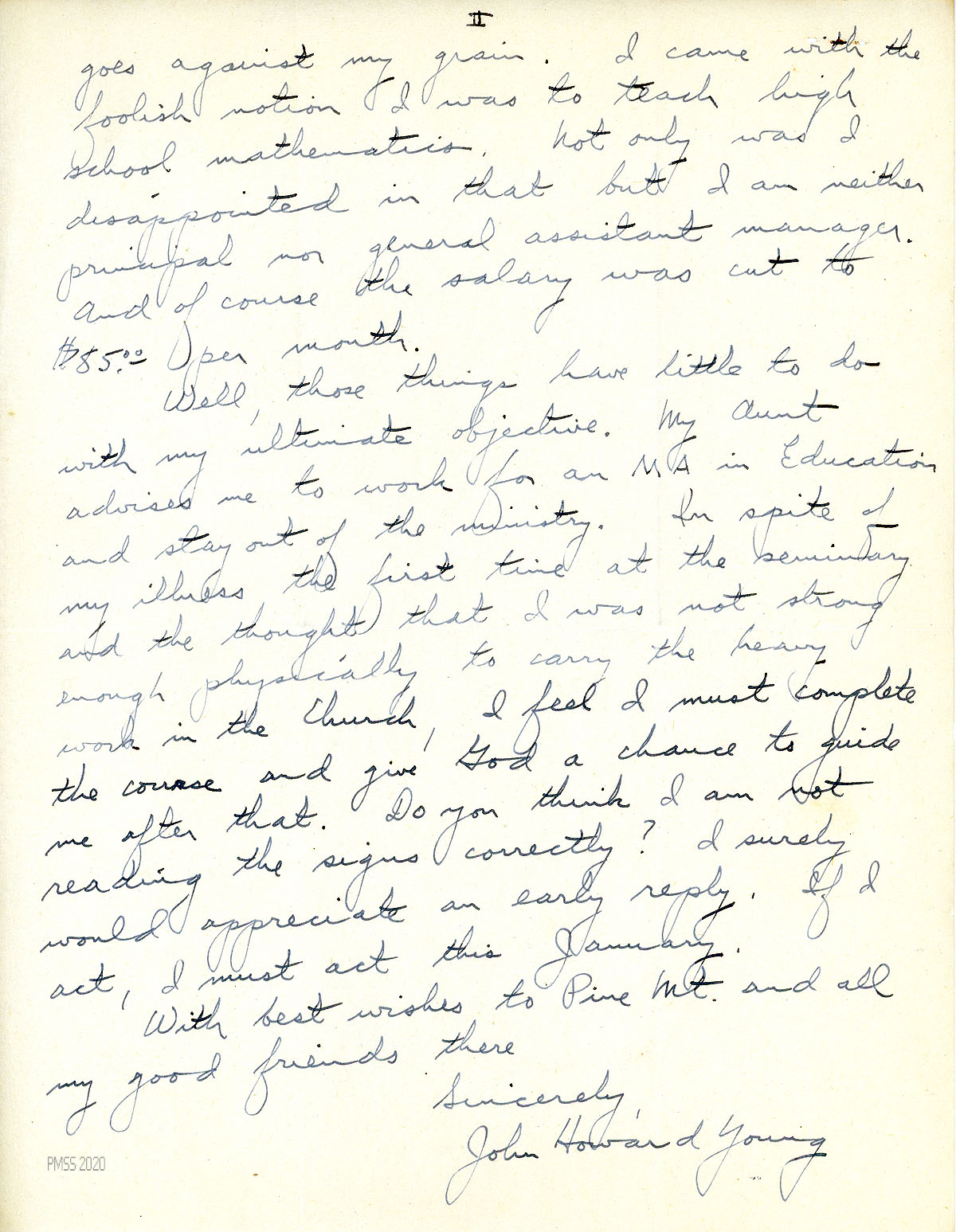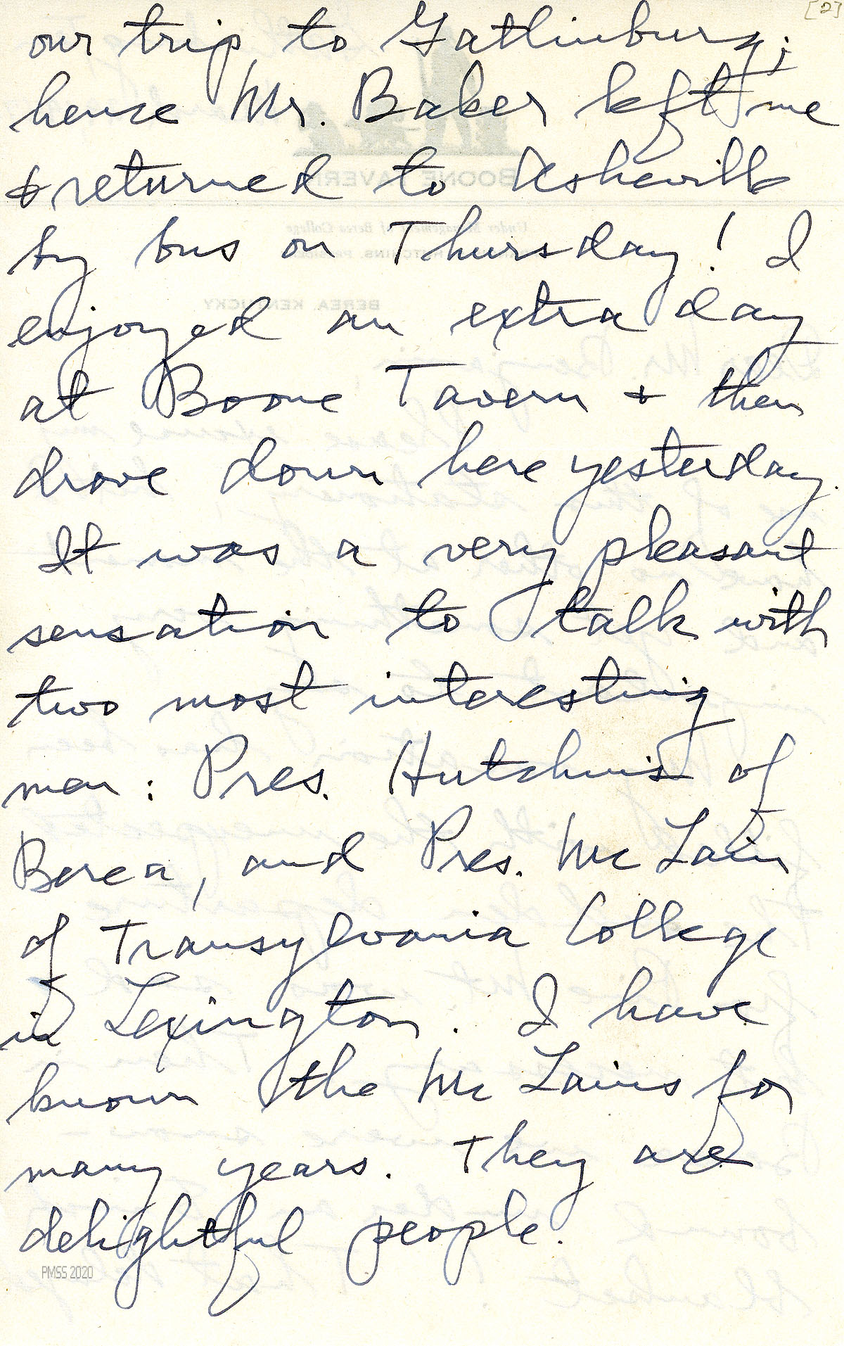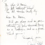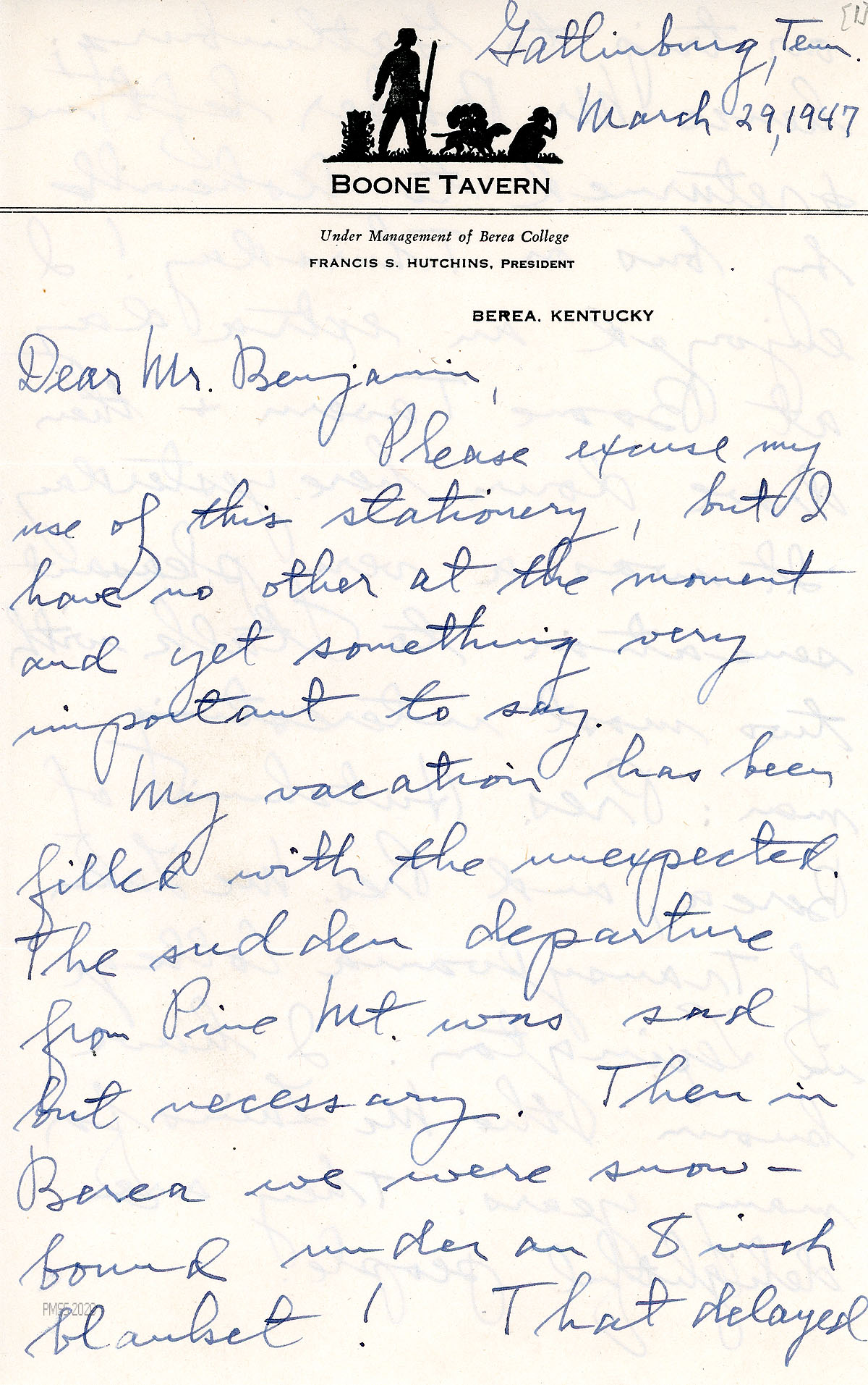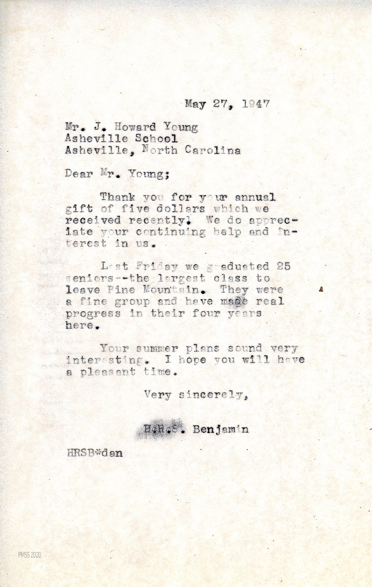 [048] May 27, 1947. To Young from Benjamin, thanking him for his annual gift of $5. “Last Friday we graduated 25 seniors — the largest class to leave Pine Mountain.”