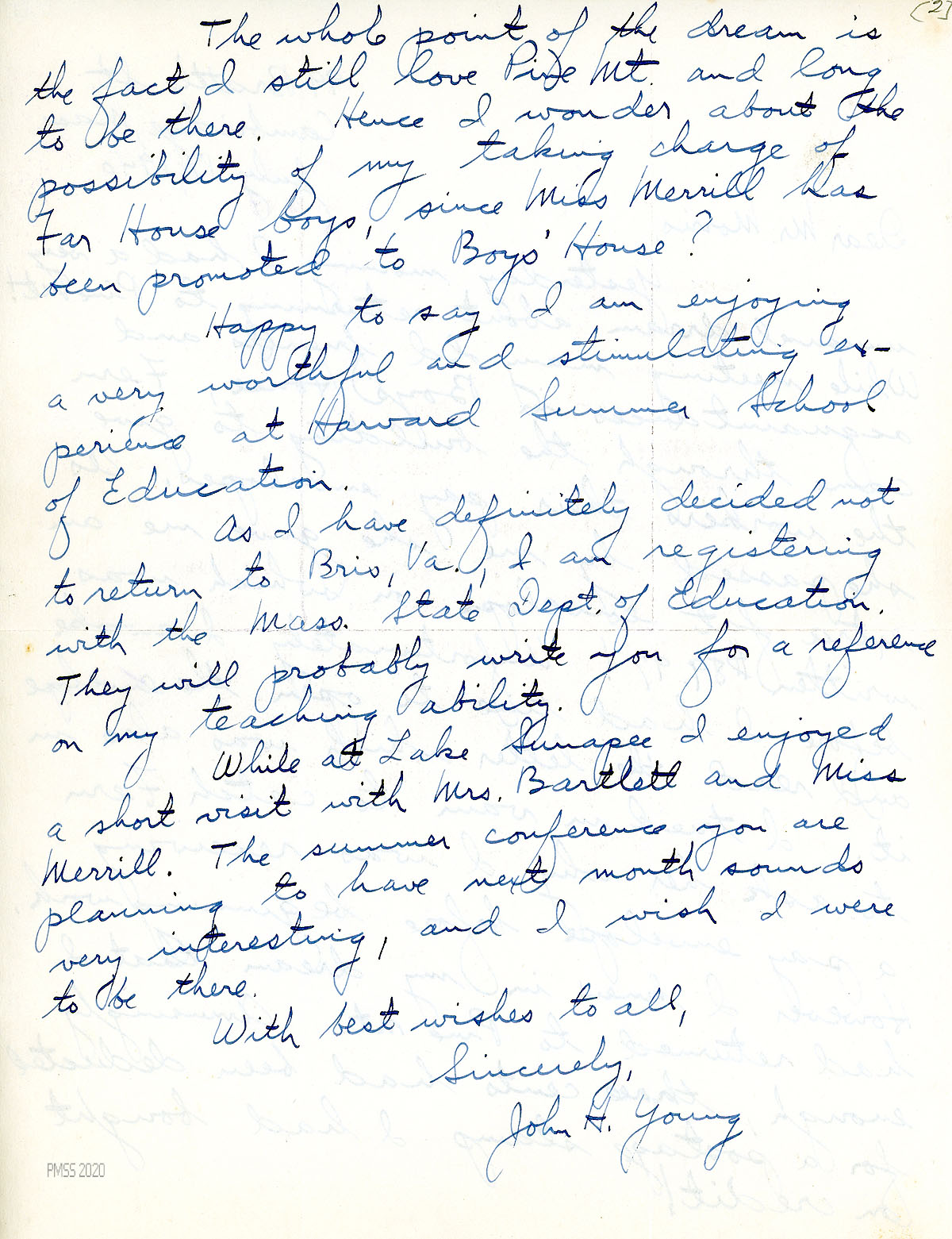 [030], [030a] July 17, 1940. Two-page letter to Morris from Young in Cambridge, MA. Describes his dream about returning to PMSS, which meant to him that “I still love Pine Mt. and long to be there.” He asks if he could take charge of Far House boys since Miss [Louise] Merrill was promoted to Boys House. He is currently enjoying Harvard Summer School of Education; decided not to return to Bris, VA; registered with the Mass. State Dept. of Education. Met with Mrs. Bartlett and Miss Merrill at Lake Sunapee.