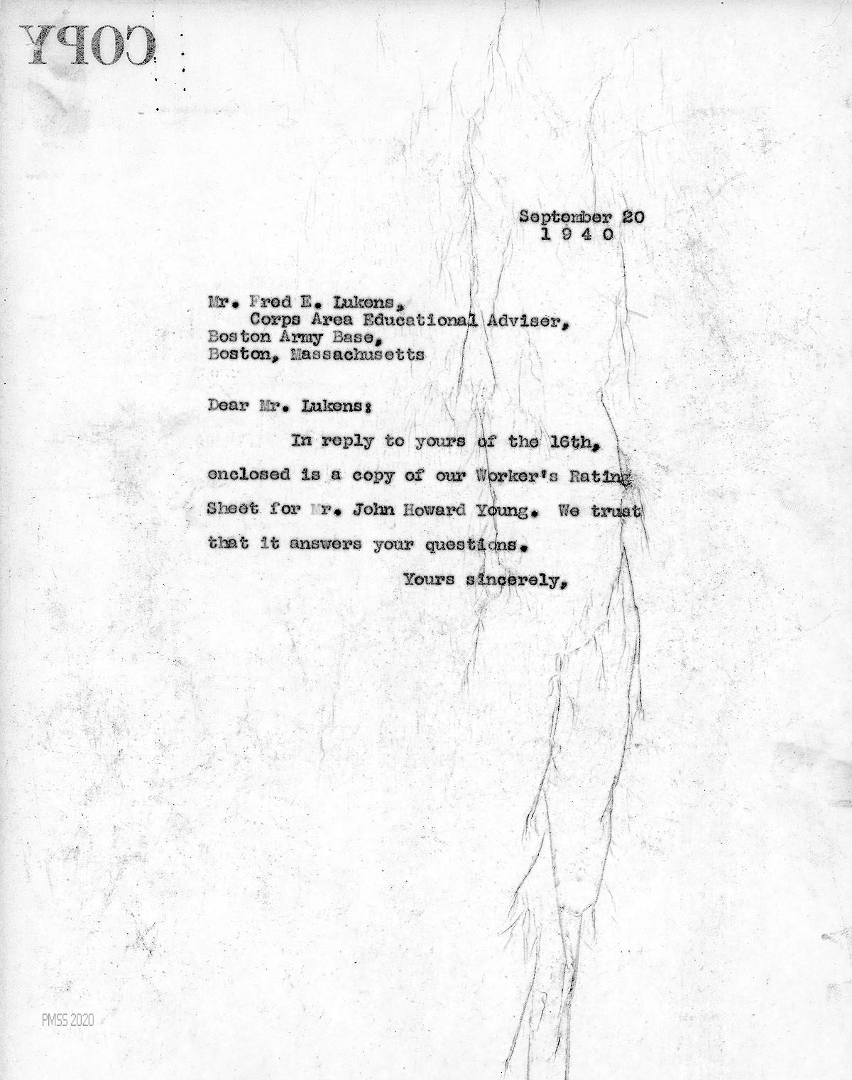 [032] September 16, 1940. To Morris from Fred E. Lukens, Corps Area Educational Adviser, Boston Army Base, Boston, MA, asking for Morris’s estimate of Young’s “ability to perform the duties of a camp educational adviser.” He describes the qualifications for the position.
