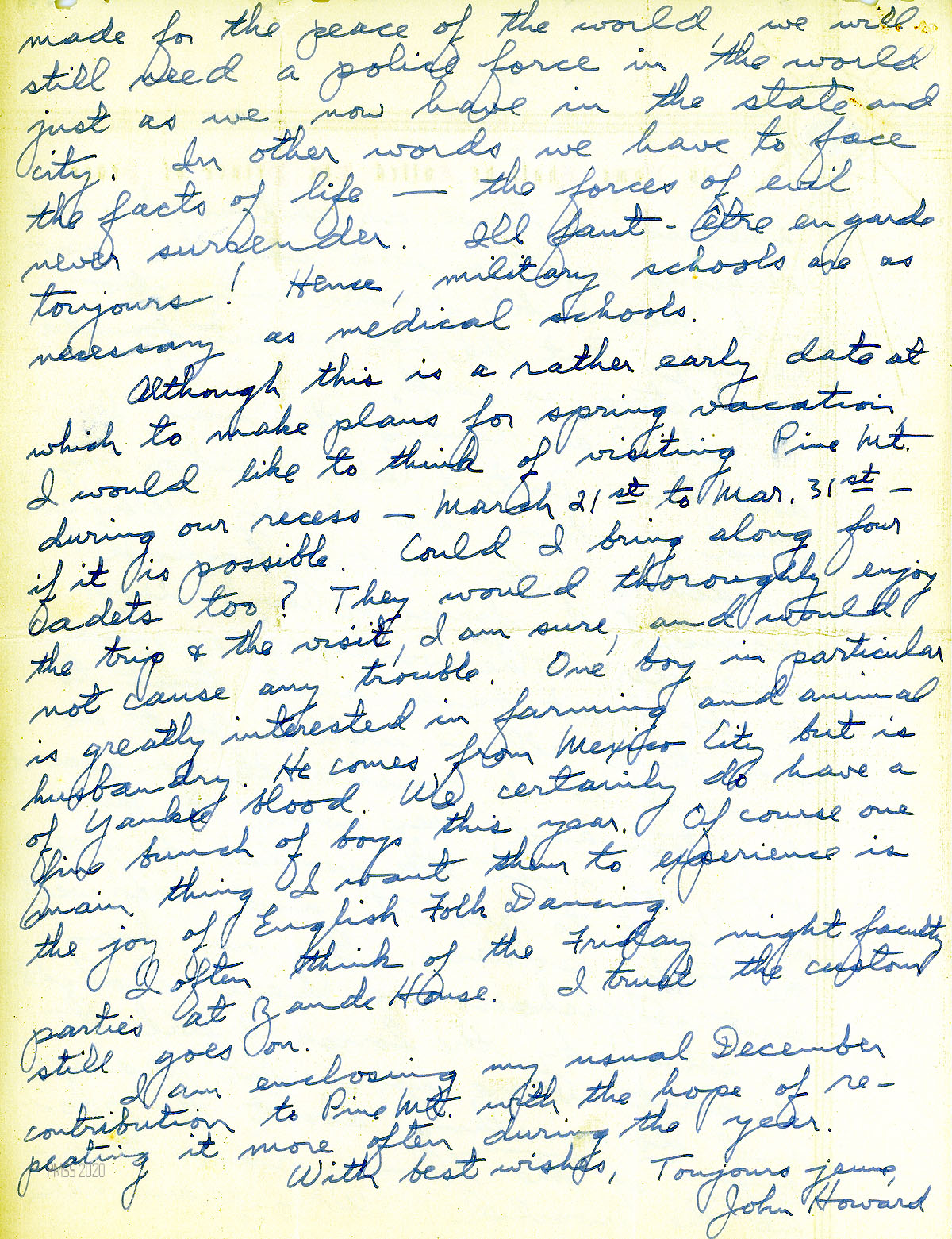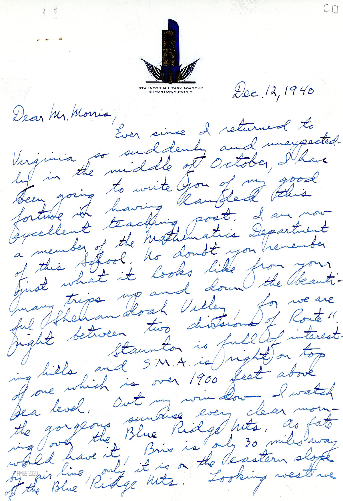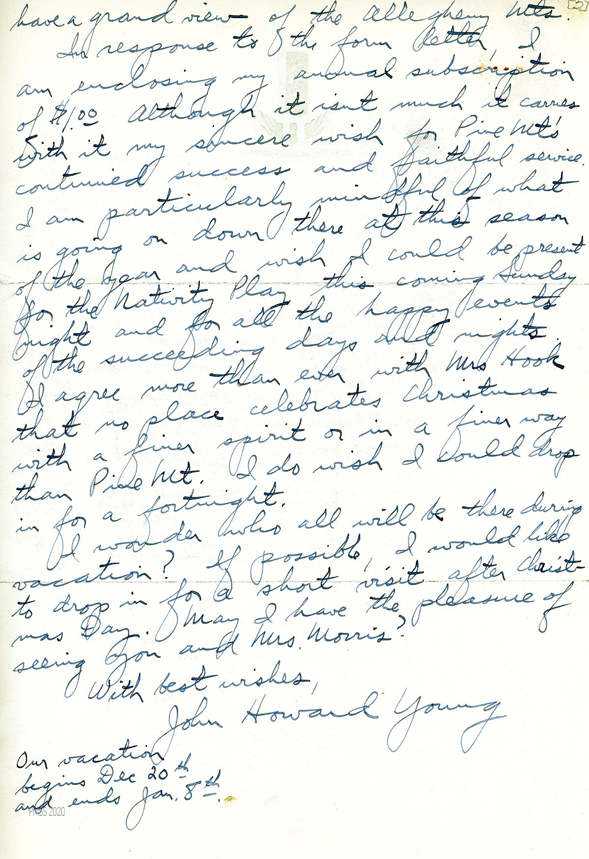 [034], [034a] December 12, 1940. Two-page letter to Morris from Young, [034] who is now teaching math at the Staunton Military Academy (SMA), Staunton, VA. “Out my window I watch the gorgeous sunrise every clear morning over the Blue Ridge Mts.” [034a] Encloses his annual subscription of $1.00. Missing PMSS, he writes, “I agree more than ever with Mrs. Hook that no place celebrates Christmas with a finer spirit or in a finer way than Pine Mt. I do wish I could drop in for a fortnight.”