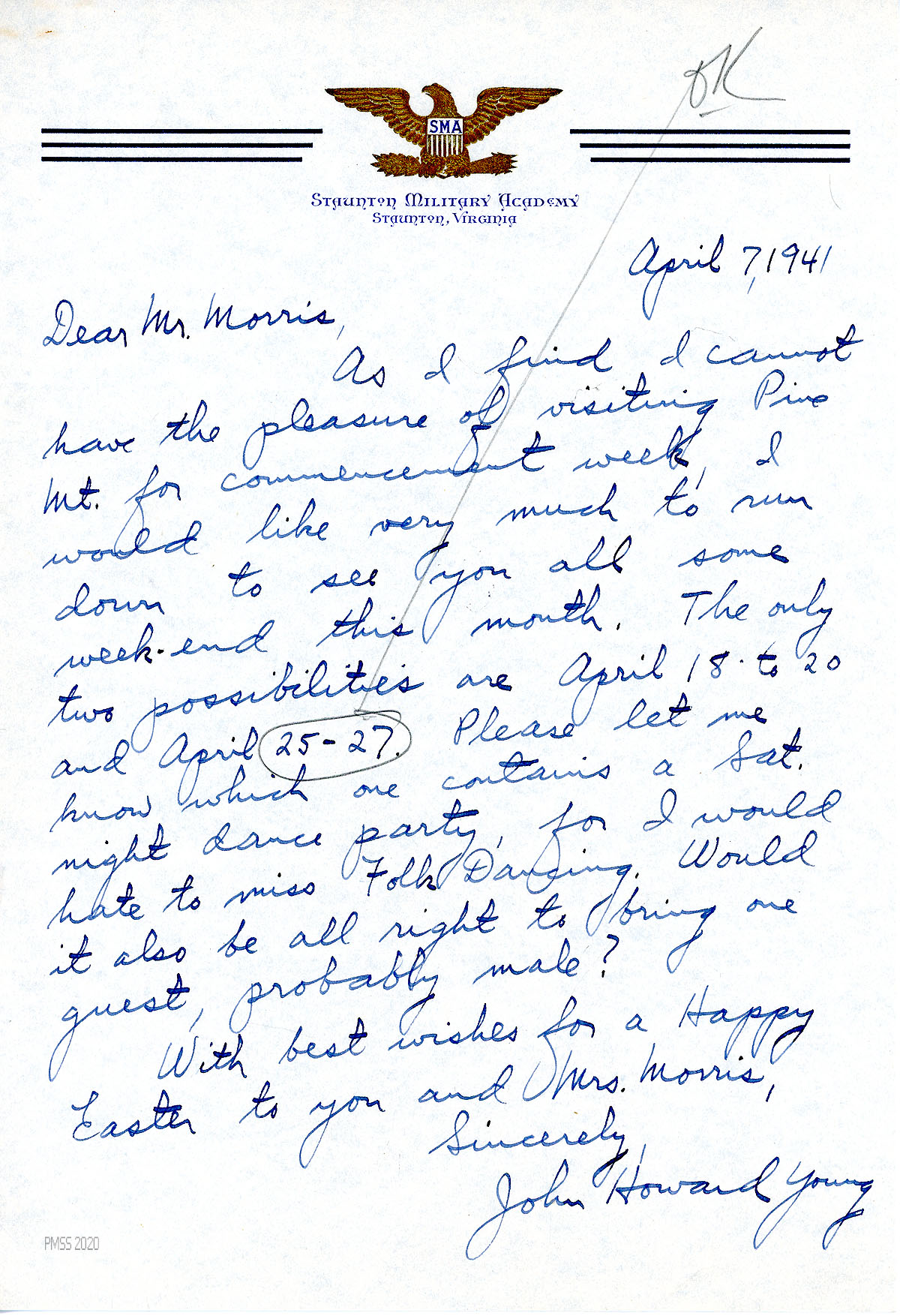 [036] April 9, 1941. To Morris from Young, asking to visit PMSS for a weekend when there is a Saturday night folk dancing party.