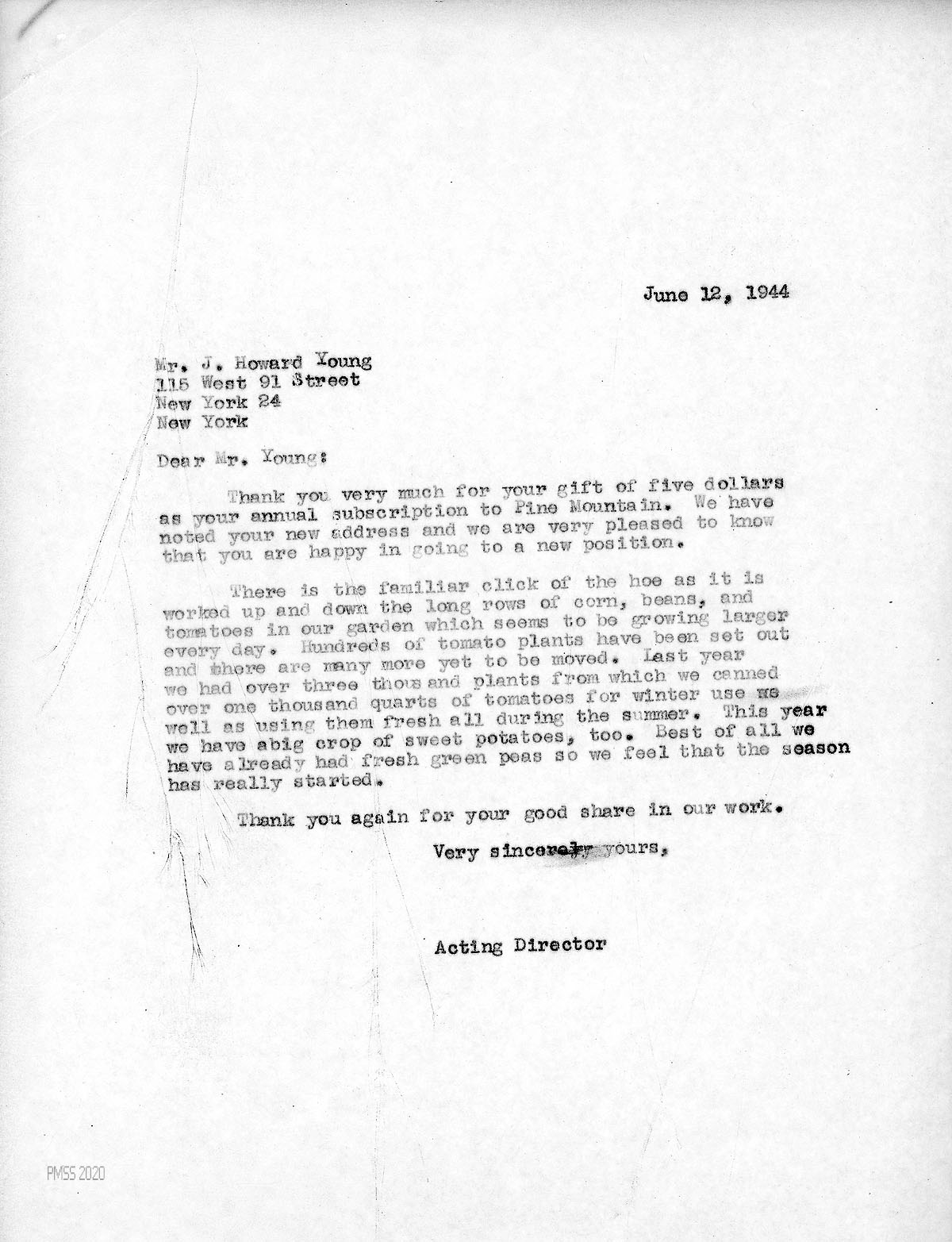 [042] June 12, 1944. To Young in New York, NY, from [Unsigned, Acting Director], who thanks Young for his gift. Describes work in the PMSS garden.