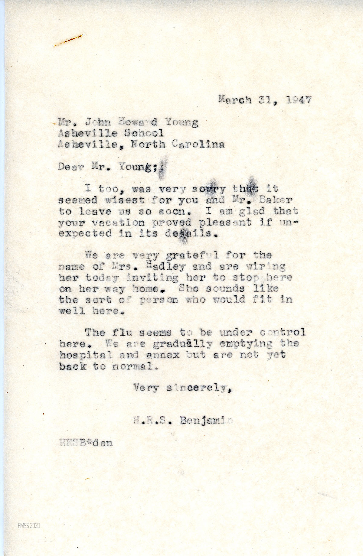 [045] March 31, 1947. To Young from H.R.S. Benjamin, who was also sorry that Young and Mr. Baker left so soon. He is wiring Mrs. Hadley and inviting her to stop at PMSS. “The flu seems to be under control here. We are gradually emptying the hospital and annex but are not yet back to normal.”