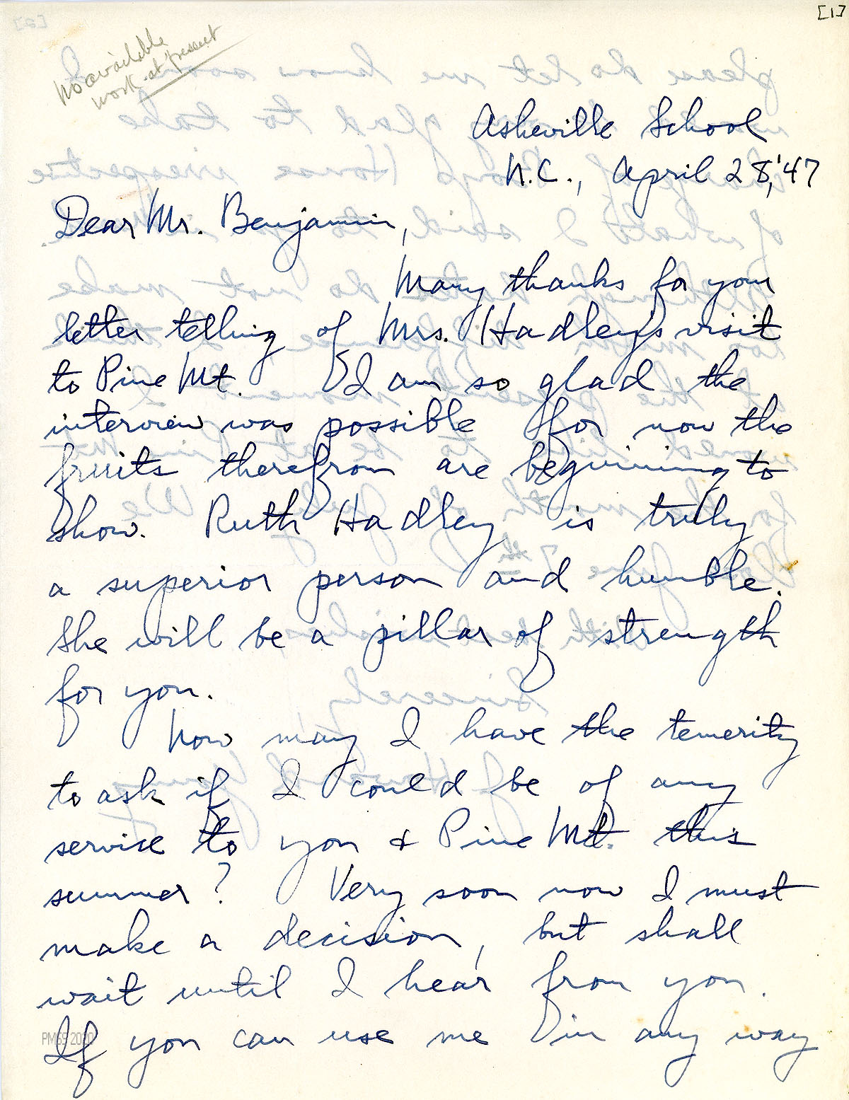 [046], [046a] April 28, 1947. Two-page letter to Benjamin from Young at Asheville (NC) School, who thanks Benjamin for meeting with Mrs. Hadley at PMSS; asks if he “could be of any service to you and Pine Mt. this summer?” such as, at Boys House. [Handwritten notation at tp of page 1: “No Available work at present.”]