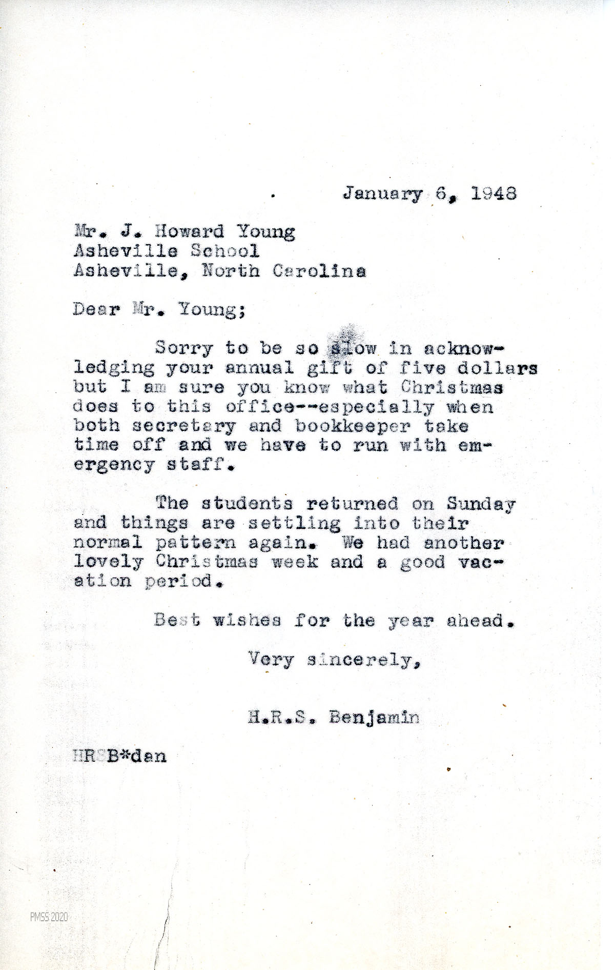 [043] November 12, 1945. To H.R.S. Benjamin from Young at Asheville (NC) School, who misses receiving PMSS NOTES and wonders if PMSS has his new and permanent address. “My many friends there will tell you who I am! Just ask Gladys Hill.”