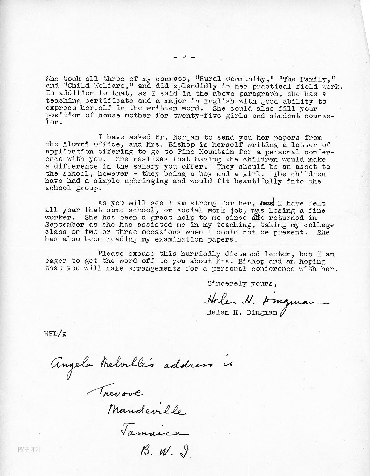 [005], [005a] May 8, 1940. Two-page typewritten letter to Morris from Helen H. Dingman, Executive Secretary on letterhead for Conference of Southern Mountain Workers, Berea (KY) College, suggesting that Angela Melville, who is at Brasstown now and is looking for a job beginning in the fall, may be able to do a good job as Coordinator of the Community Group at PMSS; provides Melville’s Jamaican address. Describes Bishop, who is just visiting with Dingman: