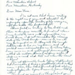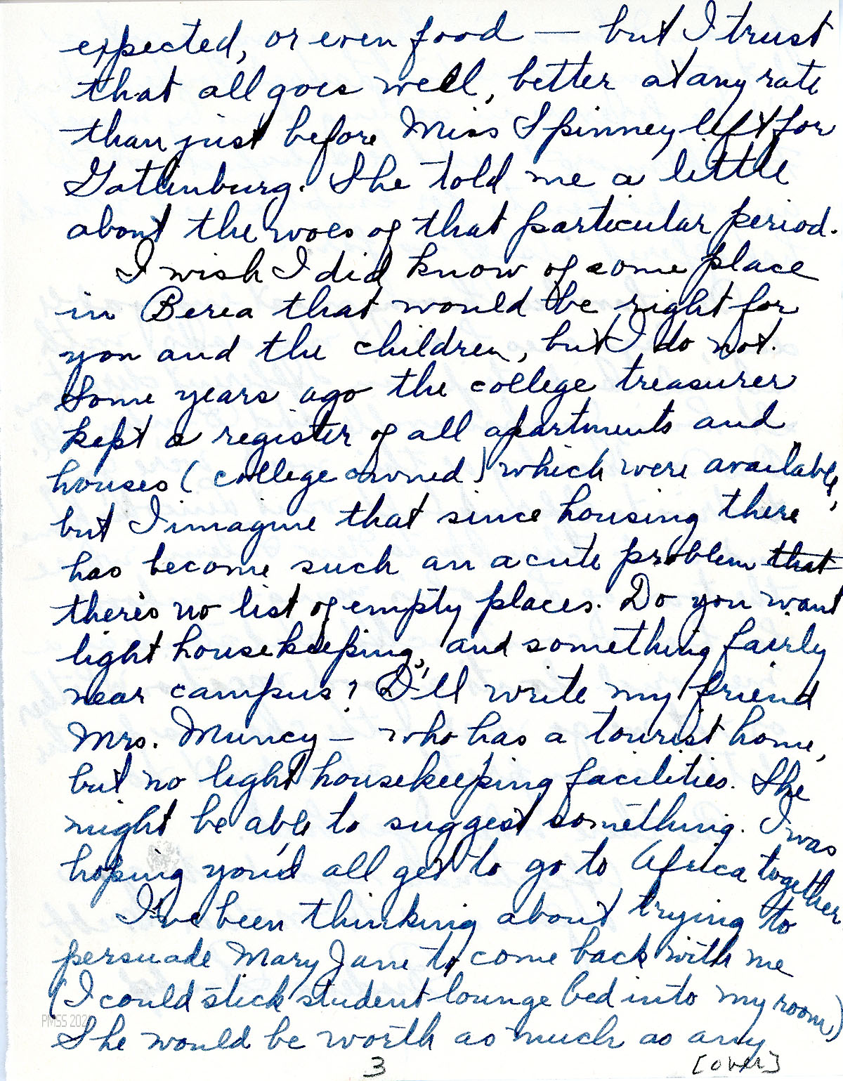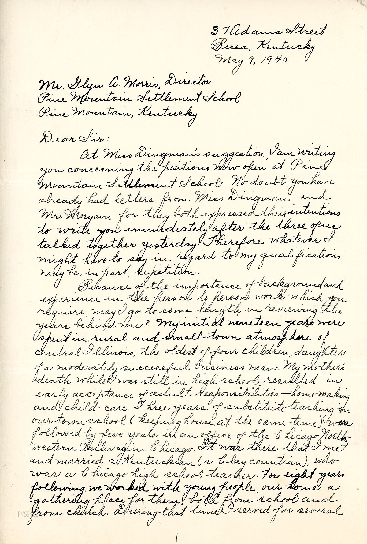[006] through [006b] May 9, 1940. Three-page letter to Morris from Bishop, concerning the PMSS positions that are open. [006] “My initial nineteen years were spent in rural and small-town atmosphere of central Illinois, the oldest of four children, daughter of a moderately successful businessman. My mother’s death while I was still in high school resulted in early acceptance of adult responsibilities — homemaking and childcare. Three years of substitute teaching in our town school (keeping house at the same time) were followed by five years in an office of the Chicago Northwestern Railway in Chicago. It was there that I met and married a Kentuckian (a Clay Countian), who was a Chicago high school teacher. For eight years following, we worked with young people, our home a gathering place for them, both from school and from church. During that time I served for several [006a, page 2] years as editor of our monthly church publication, “The Austin Congregationalist.” Summer vacations were always spent in the Kentucky hills, and my interest in and concern for young people in the mountains grew steadily with every contact.