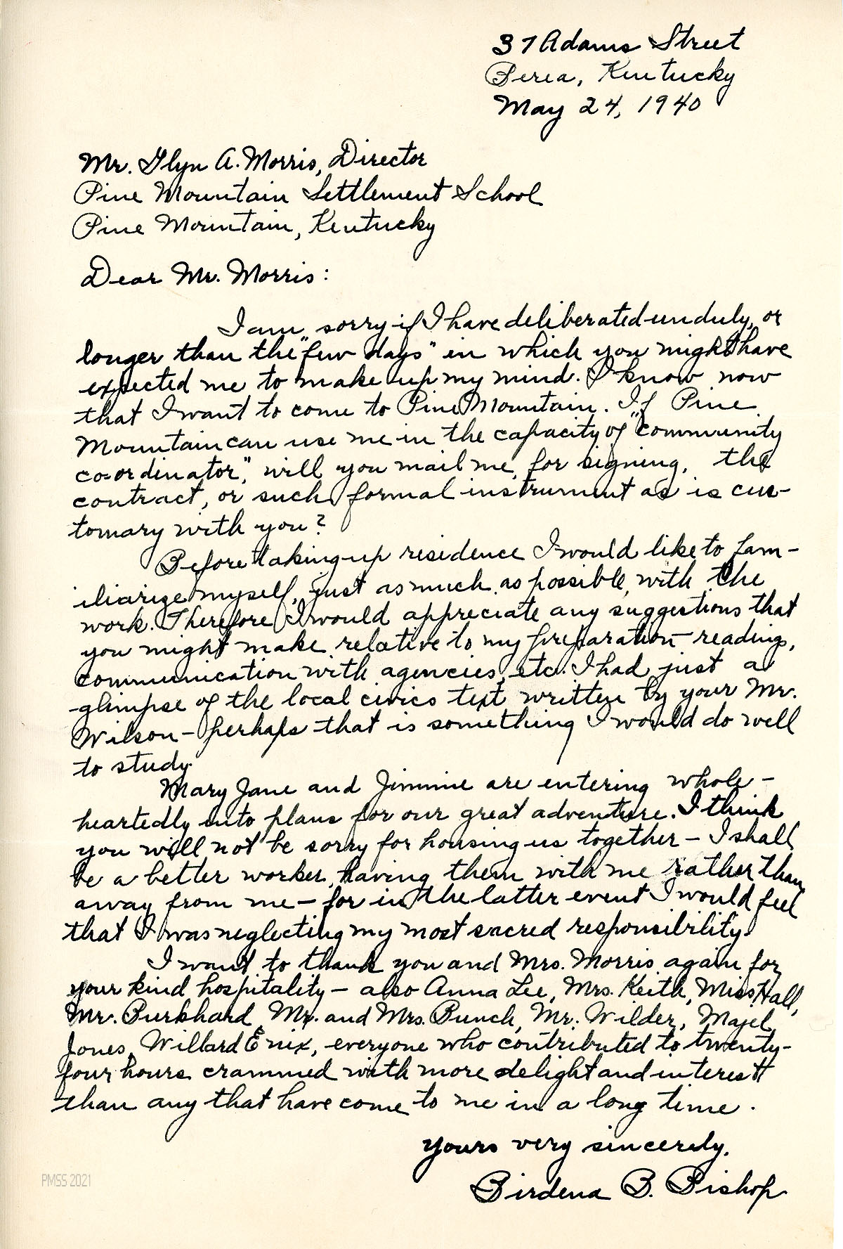 [007] May 24, 1940. To Morris from Bishop, accepting the Pine Mountain position of community coordinator. She asks for suggestions concerning preparation for the work; appreciates being housed with her children; thanks Mr. and Mrs. Morris for their hospitality — also Anna Lee, Mrs. [Alice Joy] Keith, Miss [Fern] Hall, Mr. [Fred J.] Burkhard, Mr. and Mrs. Bunch, Mr. [Brit] Wilder, Majel Jones, Willard Enix, “everyone who contributed to twenty-four hours crammed with more delight and interest than any that have come to me in a long time.”