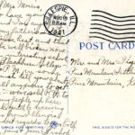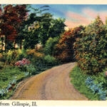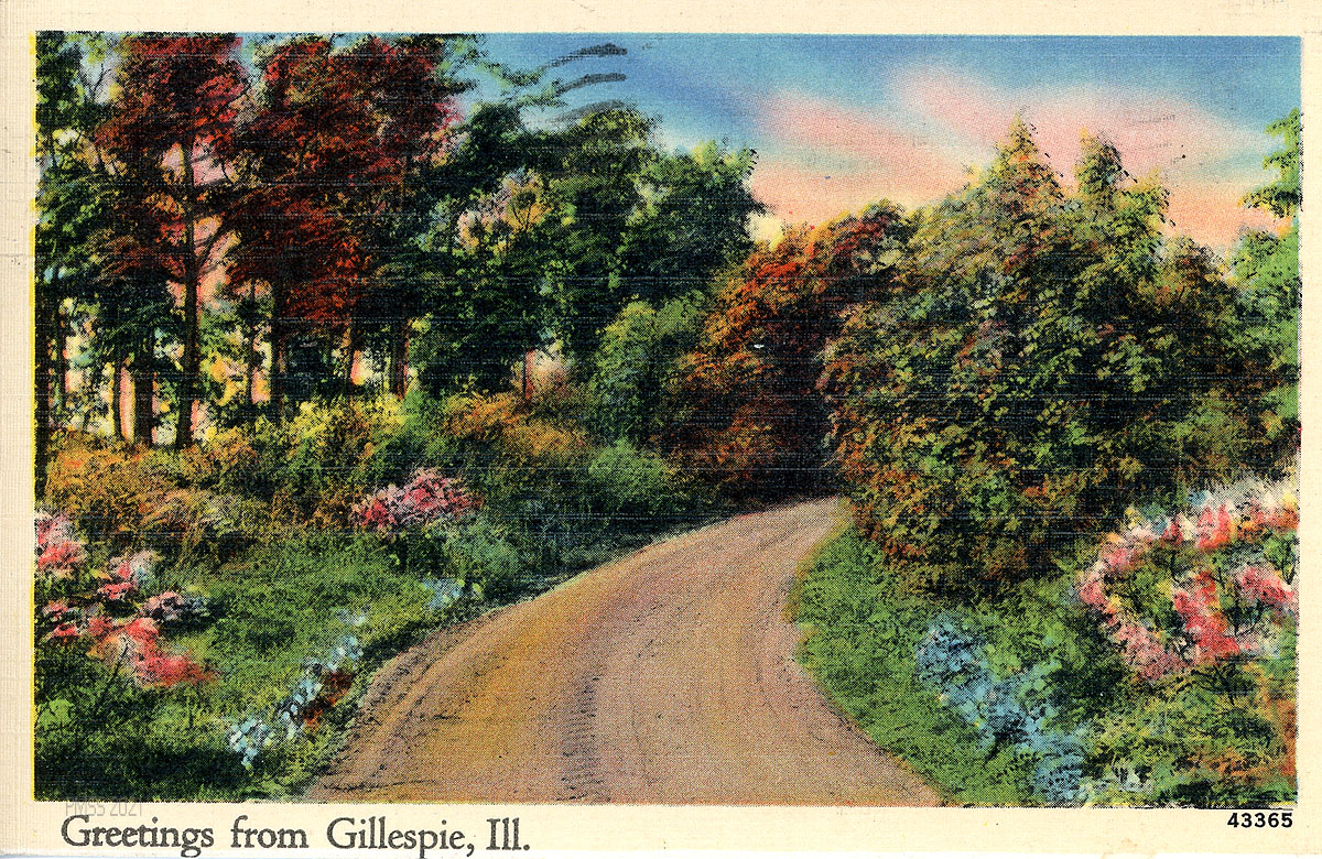 [018] August 18, 1941. Address side of postcard to Mr. and Mrs. Glyn A. Morris at PMSS, from “Birdena, Jane & Jim Bishop.” Visited Blackburn College (Carlinville, IL), “similar to P.M. in some respects. … We’ve sold P.M. to so many young people up here that I think you’ll be receiving applications from Illinois.” [018a] Picture side of postcard with “Greetings from Gillespie, Ill.”