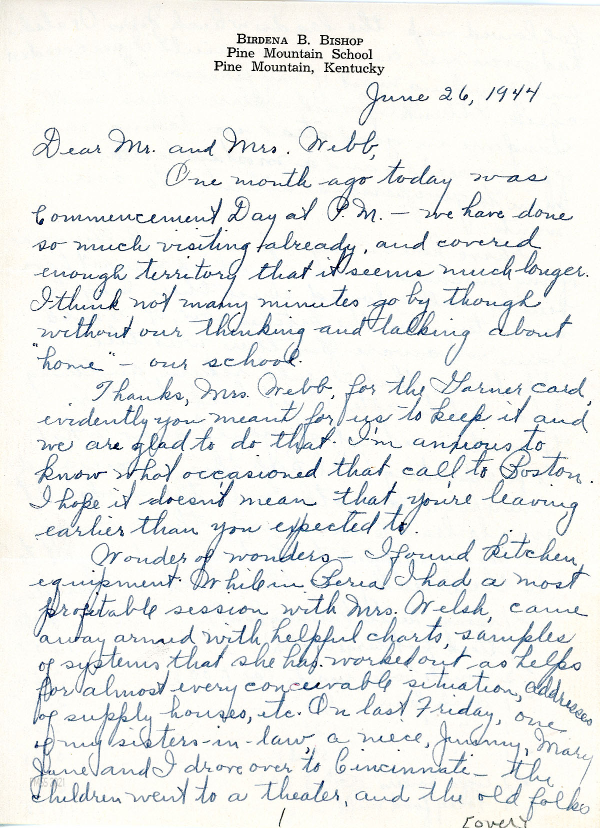 BIRDENA BISHOP CORRESPONDENCE I 1940-1946: This is part 1 of images of documents and a list of their contents concerning Mrs. Birdena Bishop’s application for a position at the Pine Mountain Settlement School, contracts authorizing her employment, and letters she wrote to the PMSS staff while on summer vacations. For Part 2 of her correspondence in the years after she left Pine Mountain, go to BIRDENA BISHOP Correspondence II 1946-1962.