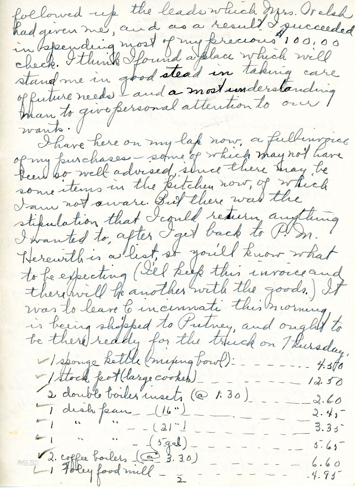 [022] through [022c] June 26, 1944. Four-page letter to Mr. and Mrs. Webb from Bishop on PMSS stationary. “I think not many minutes go by … without our thinking and talking about ‘home’ — our school.’ She thanks Mrs. Webb for the “Garner card”; found kitchen equipment while in Berea with Mrs. Welsh’s help; Lists her kitchen purchases and prices.