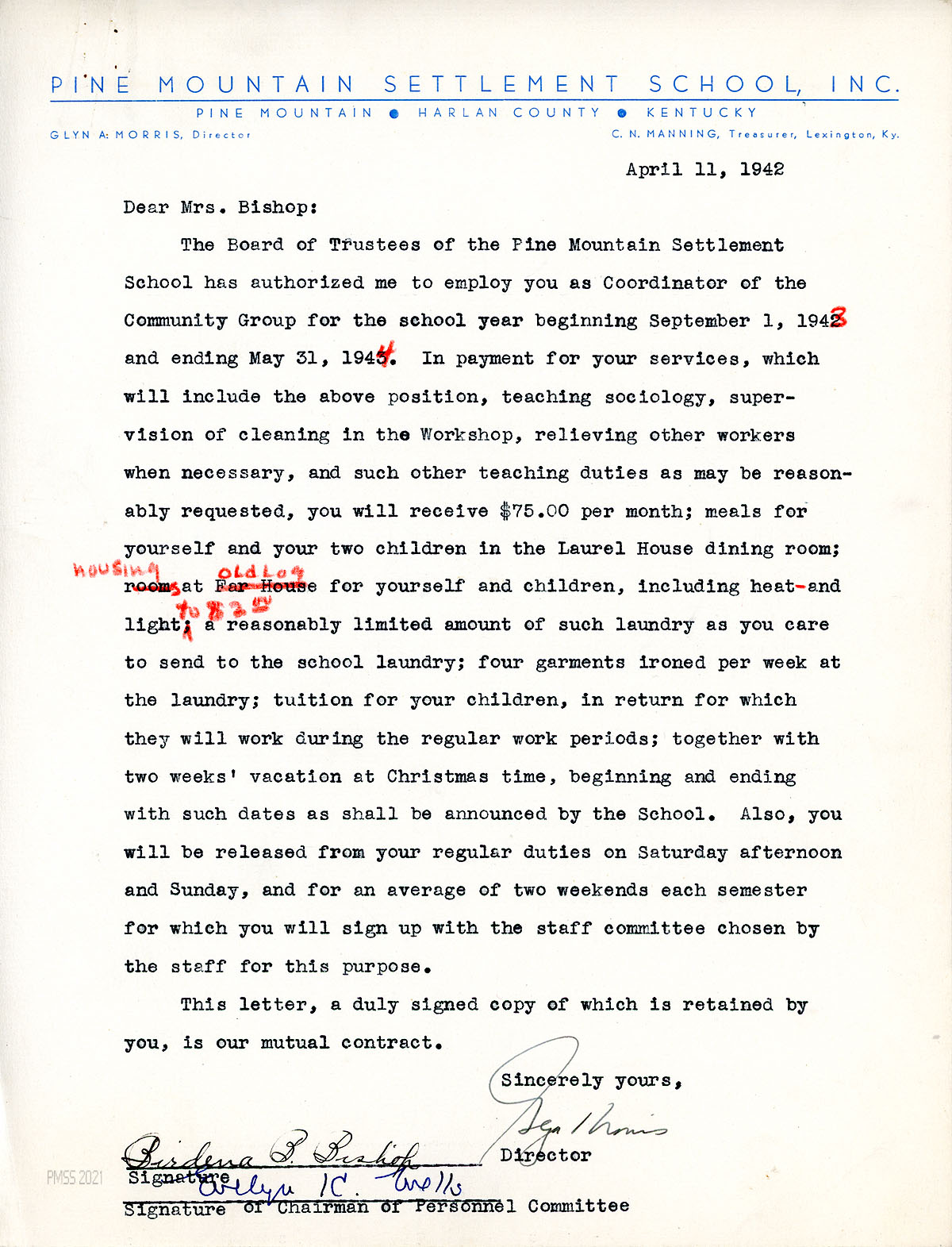 [026] April 11, 1942. Contract. To Bishop from Glyn Morris, Director, who has been authorized by the Board of Trustees to employ Bishop as Coordinator of the Community Groups for the school year 1942-1943 (The dates are revised in red ink to 1943-1944); also teaching sociology, supervising the cleaning of the Workshop, relieving other workers when necessary, and other teaching duties; salary is $75 per month; room at Far House for Bishop and her children (revised in red ink to “Housing at Old Log); and other stipulations.