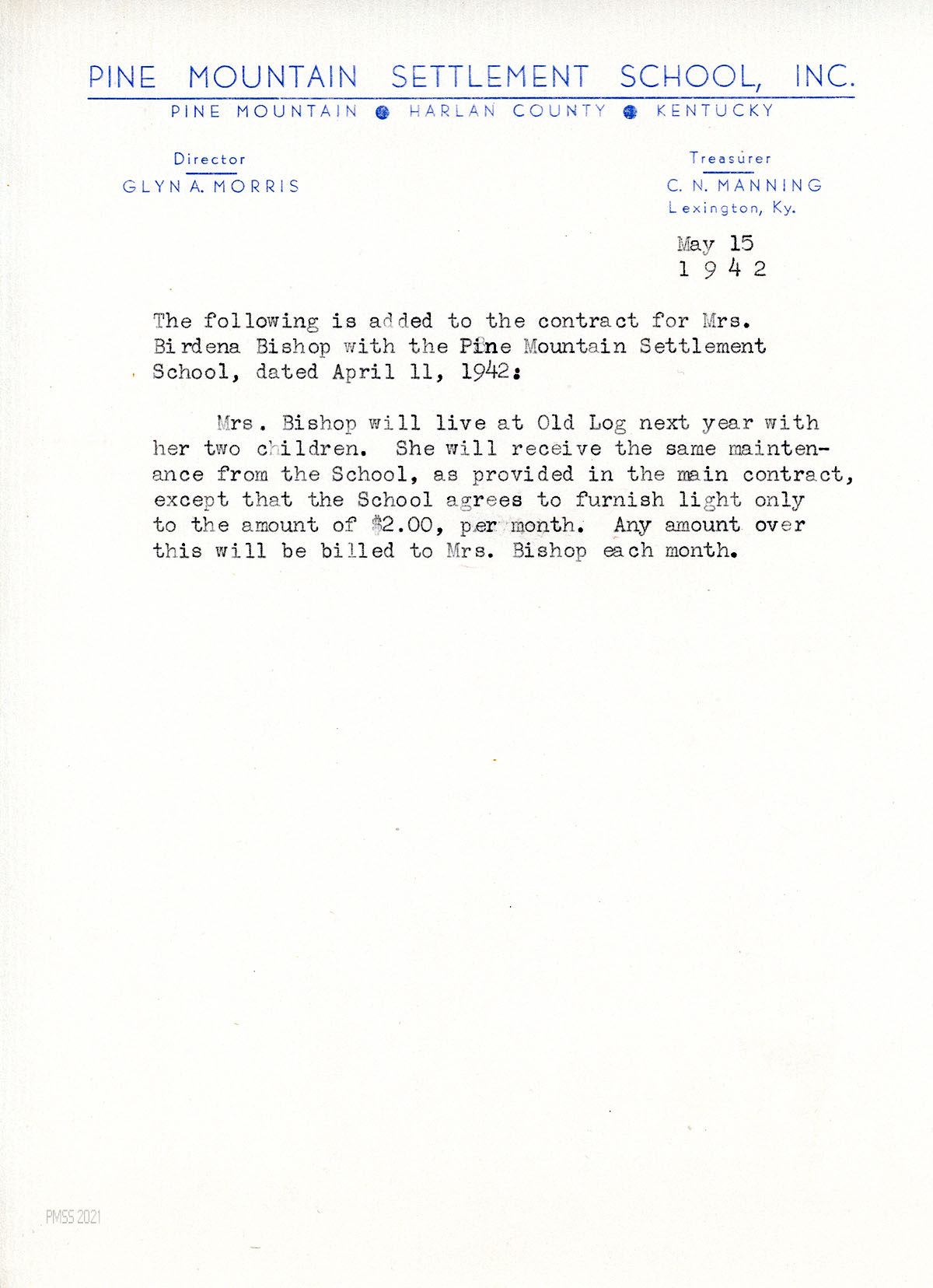 [027] May 15, 1942. Addenda to April 11, 1942, contract: “Mrs. Bishop will live at Old Log next year with her two children.”; PMSS will pay $2 per month for light.