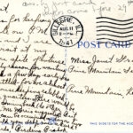 [017] August 11, 1941. Address side of postcard to Janet Grant at PMSS from Bishop, who asks to be alerted if Far House would be available if she arrives a few days earlier. [017a] Picture side of postcard with “Greetings from Gillespie, Ill.”