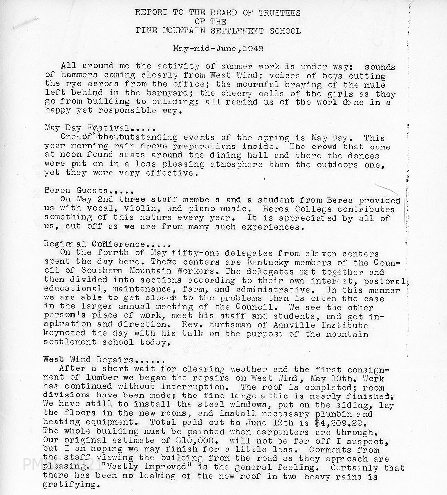 [May-June-01] May-mid-June 1948. Describes sounds of summer work; May Day Festival; Three Berea College staff members and a student provided vocal, violin, and piano music, done each year by the college; meeting at PMSS by 51 delegates of the Council of Southern Mountain Workers with a keynote talk by Rev. Huntsman of Annville Institute “on the purpose of the mountain settlement school today.” West Wind work was completed on the roof, rooms divisions, attic; Work still to be done includes installation of steel windows, siding, floors, plumbing and heating equipment, and painting the whole building; “Our original estimate of $10,000 will not be far off I suspect….”