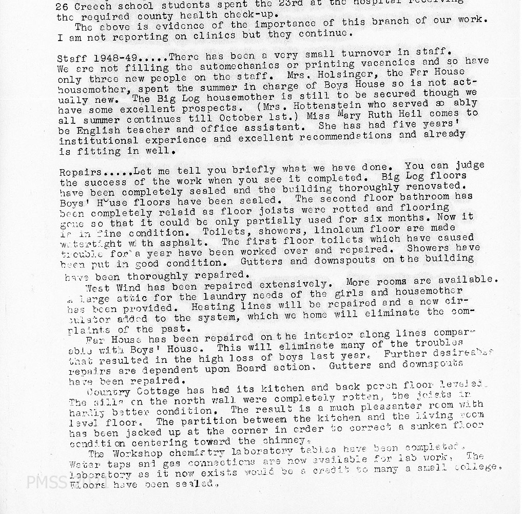 [May-June-01a] 1948-49 Contracts are complete for all positions except printer, Big Log, housemother, office assistant, and English instructor; Miss Beck, PMSS’s second nurse will resign Oct. 1. A total of 4,475 April appeal letters were sent out and resulted in higher than usual donations; thanks to Miss Wells for suggestions and assistance.
