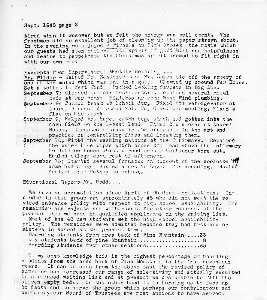 [Sept-02] Page 2, Fair Day (continued). Evening movie (A Miracle on 34th Street). Excerpts from Supervisors’ Monthly Reports from Mr. Wilder and Mr. Dodd’s Educational Report (Dodd mentions the effects of the revised entrance policy concerning high school availability).