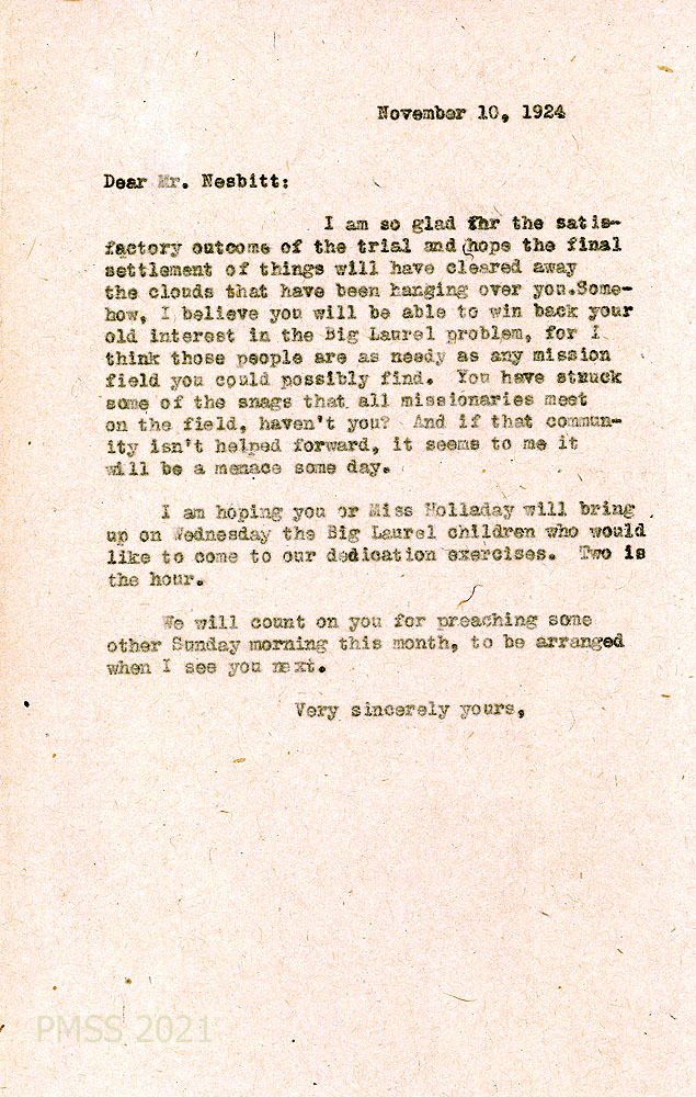 [038] November 10, 1924. To Nesbitt from [unsigned, likely Zande], who is glad for the “satisfactory outcome of the trial…I believe you will be able to win back your old interest in the big Laurel problem, for I think those people are as needy as any mission field you could possibly find. You have struck some of the snags that all missionaries meet on the field, haven’t you? And if that community isn’t helped forward, it seems to me it will be a menace some day.” She hopes that he preach “some other Sunday morning this month….”