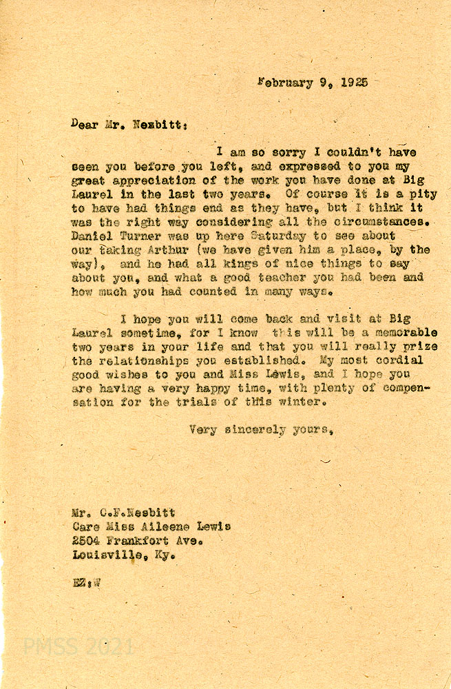 [039] February 9, 1925. To Nesbitt, ℅ Miss Aileene Lewis, Louisville, KY, from EZ (Zande), who regrets having missed him before he left and to express “great appreciation of the work you have done at Big Laurel in the last two years. Of course it is a pity to have had things end as they have, but I think it was the right way considering all the circumstances.” Mentions Daniel Turner who praised Nesbitt’s teaching. Invites him to return for a visit at Big Laurel, “for I know this will be a memorable two years in your life and that you will really prize the relationships you established.” Sends her good wishes to Nesbitt and Miss Lewis.