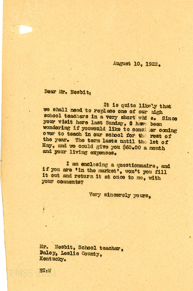 [001] August 10, 1922. To “Mr. Nesbitt, School Teacher, Daley, Leslie County, Kentucky,” from EZ (Ethel de Long Zande). Following a recent visit Nesbitt made to the School, Zande asks if he would teach until the end of the term (May 1), as a replacement; at $60 a month plus living expenses. Encloses questionnaire.