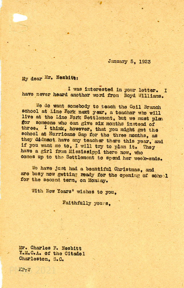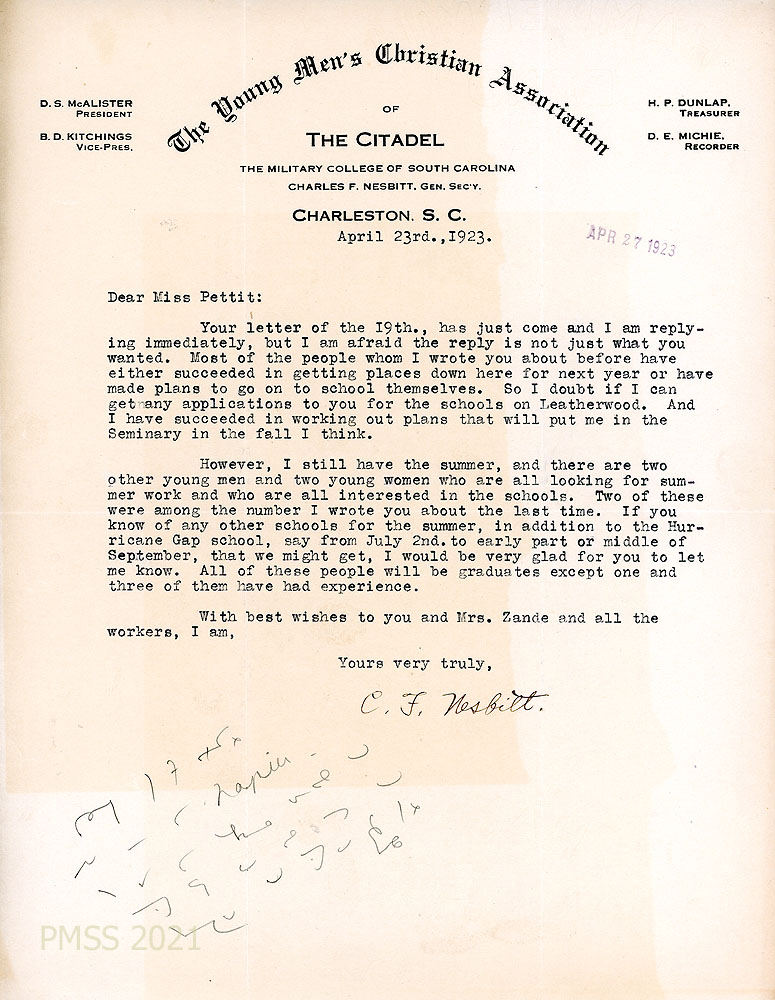 [002] December 19, 1922. Two-page typewritten letter to Katherine Pettit from Charles F. Nesbitt on letterhead for “The Young Men’s Christian Association of The Citadel, The Military College of South Carolina, Charleston, S.C.” at which he is the General Secretary. He regrets that Boyd Williams did not attend PMSS; follows the progress of PMSS; plans to attend the Seminary in fall or winter 1922 and has time beforehand when he “could teach somewhere in the mountains.” He cites financial reasons for not attending the Seminary this year. Mentions another young man who is also interested in PMSS.