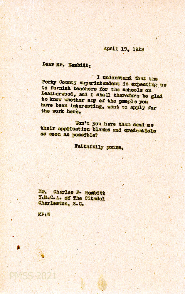 [006] April 19, 1923. To Nesbitt from KP (Pettit) reporting that the Perry County superintendent “is expecting us to furnish teachers for the schools on Leatherwood.” She asks Nesbitt to have those who are interested to send in their applications.