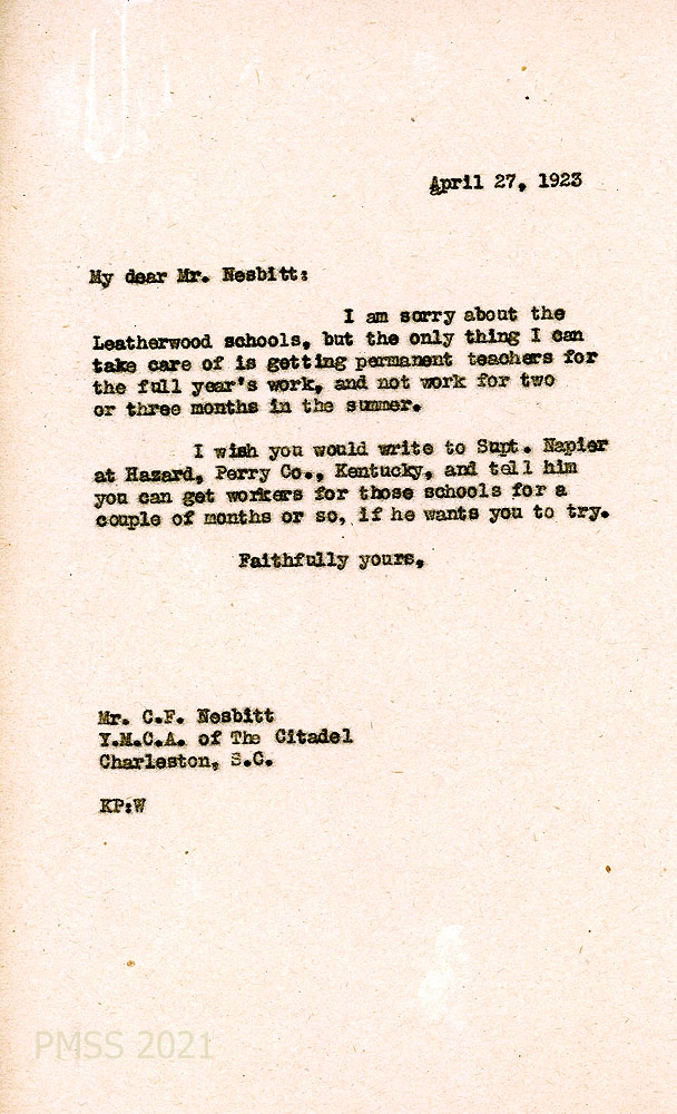 [008] April 27, 1923. To Nesbitt from KP (Pettit), who does not need summer workers; suggests writing to Superintendent Napier at Hazard, KY.