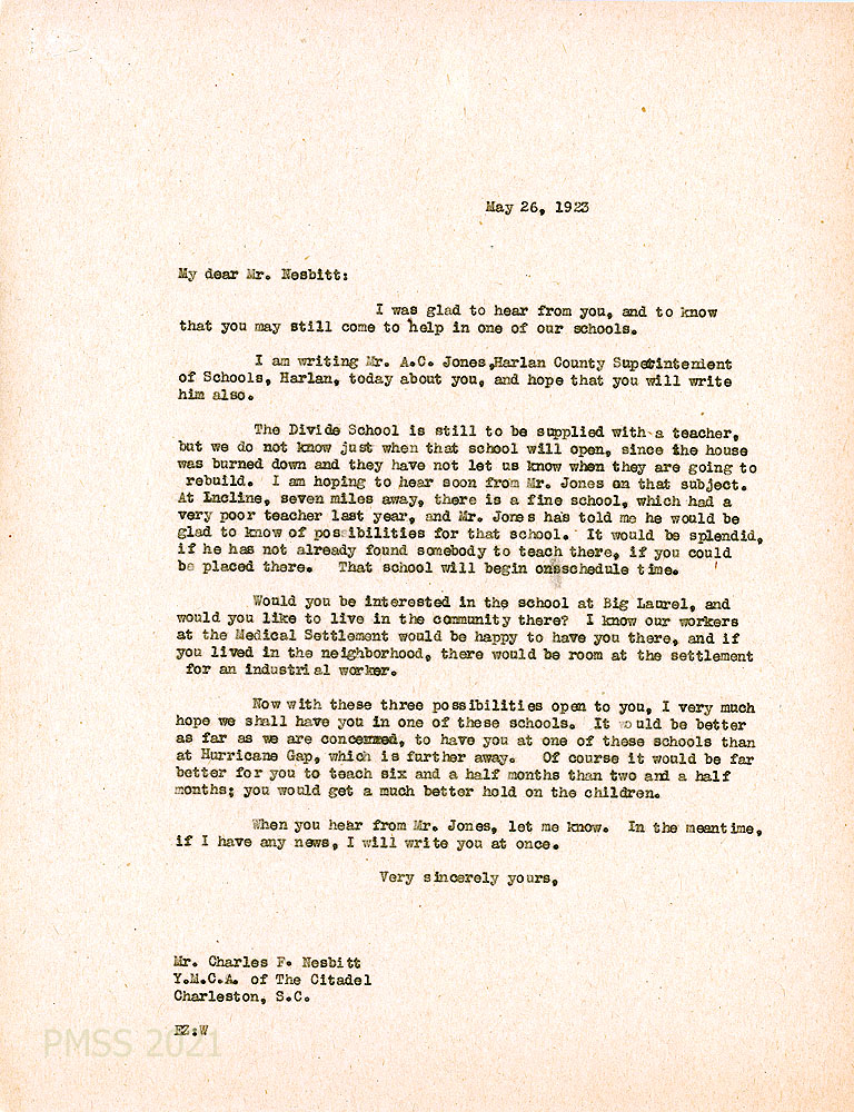 TAGS: Charles F. Nesbitt, correspondence, YMCA of the Citadel, Military College of South Carolina, Katherine Pettit, Ethel de Long Zande, rural schools, Medical Settlement at Big Laurel, Emory University, Mr. and Mrs. Henry Creech, teacher prospects, theological seminary, A.C. Jones, Harlan County Superintendent of Schools, Aileen Lewis